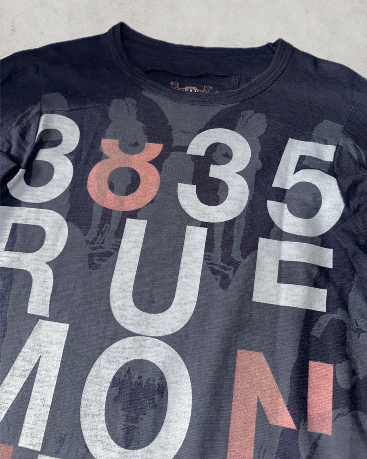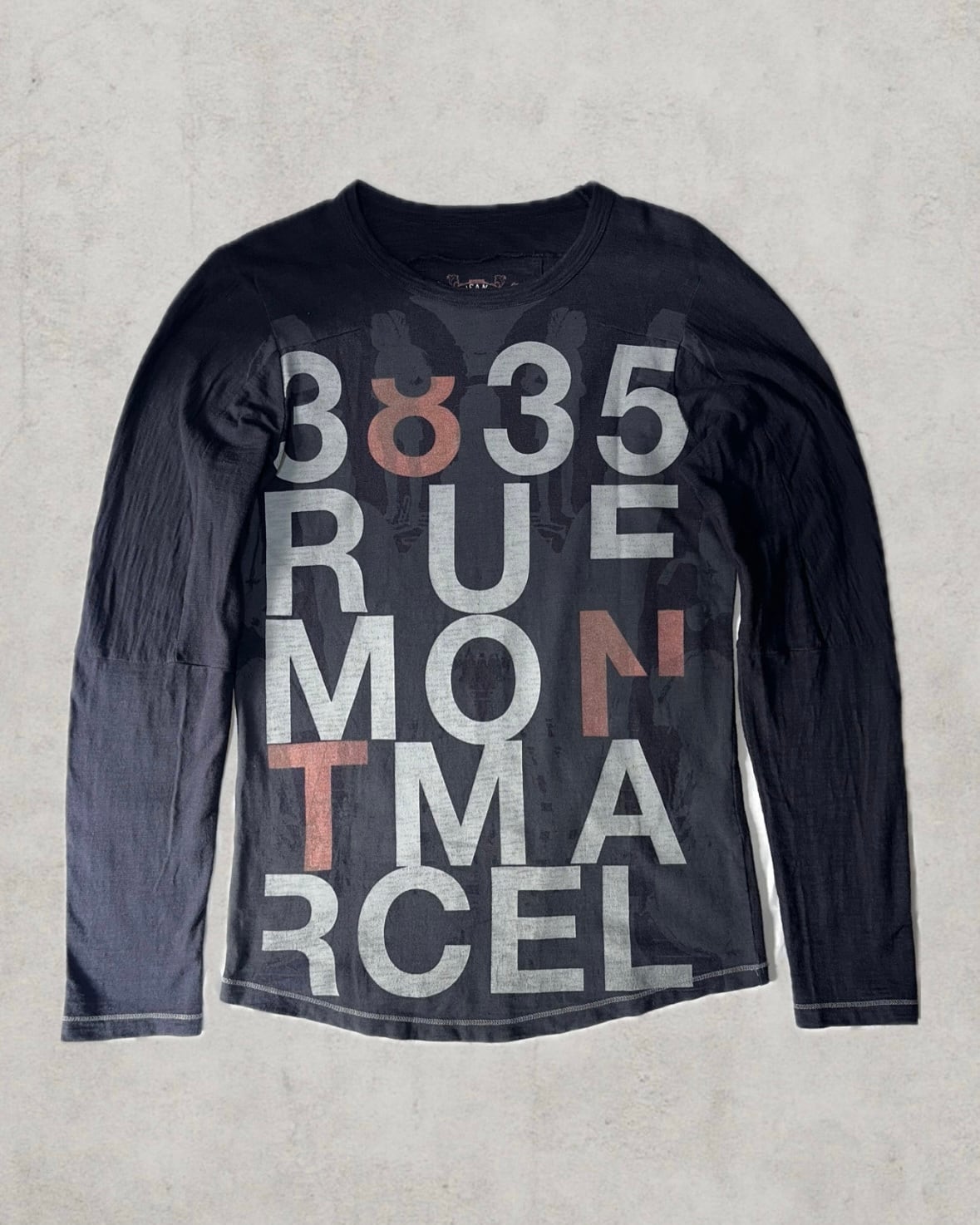 フランス・パリに実在するRue Montmartre(モンマルトル通り)と“3835”を大胆に配したグラフィックが印象的。タイトなシルエットと生地の風合いがアーカイブピースとしての存在感を放つ。
