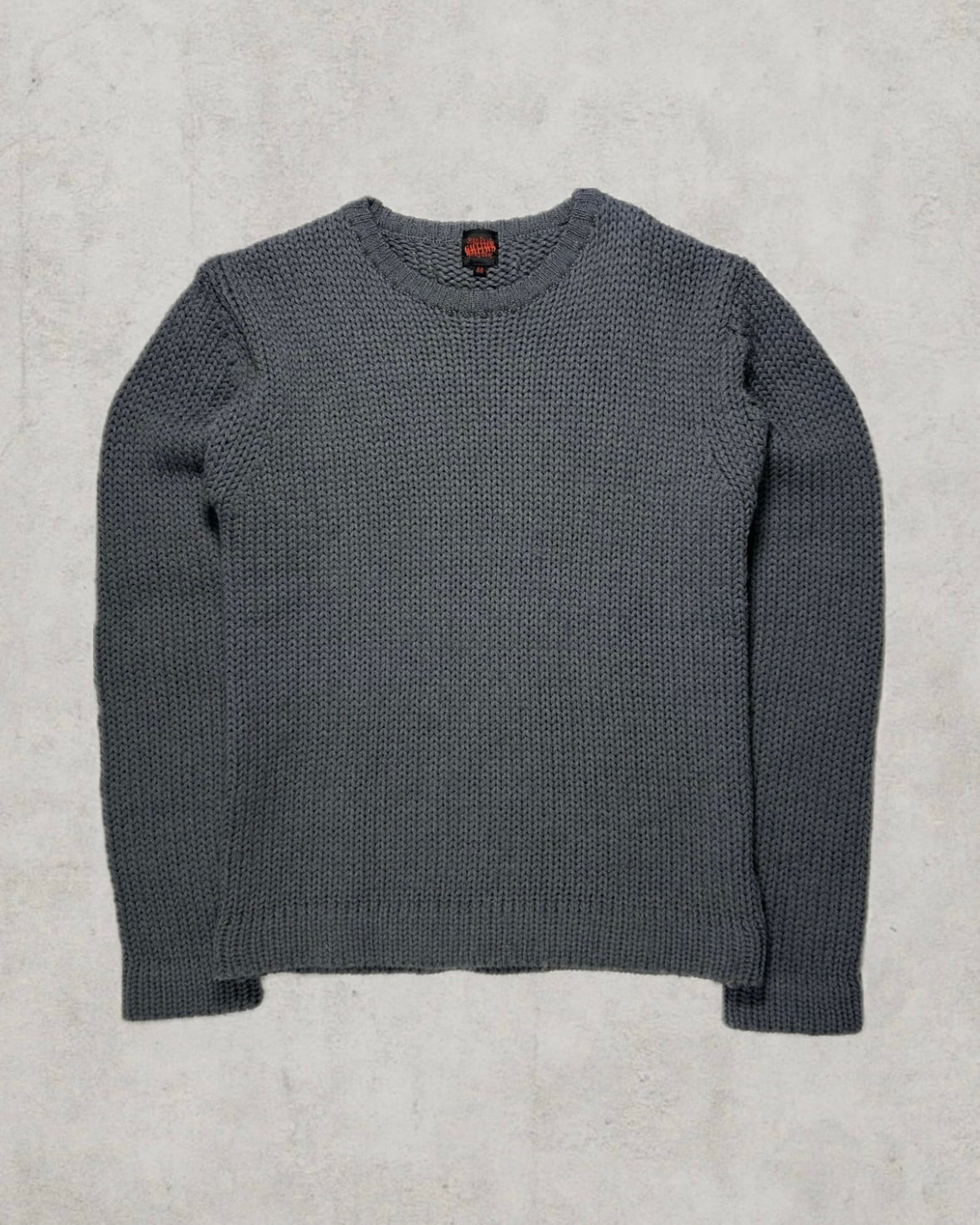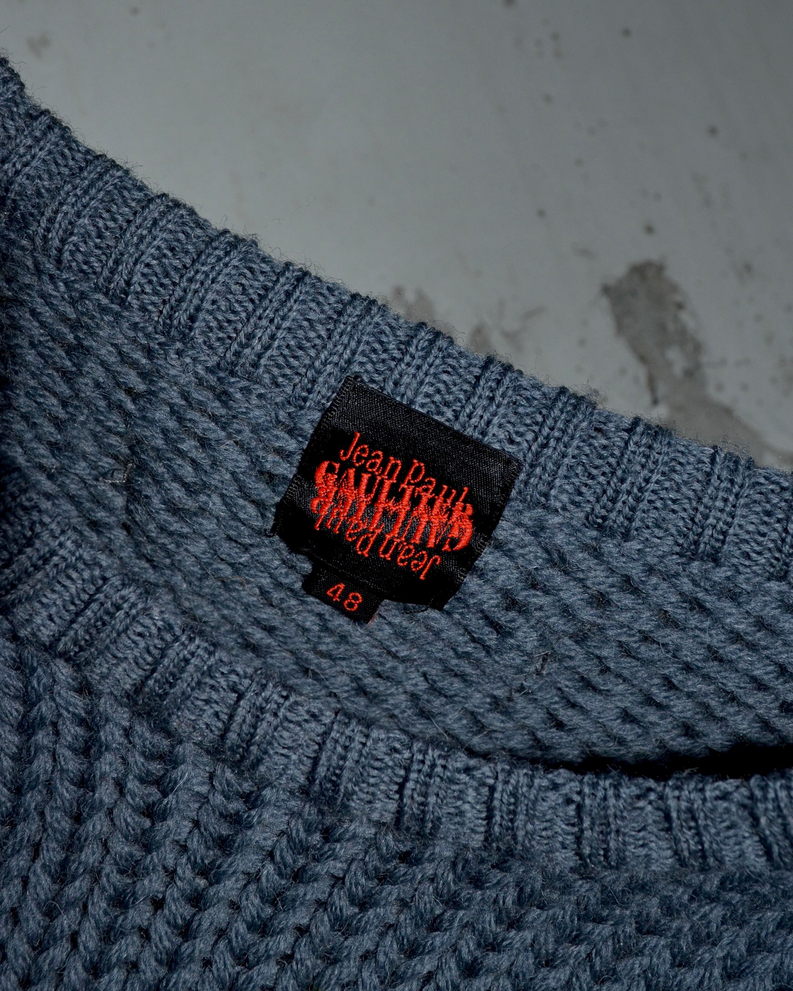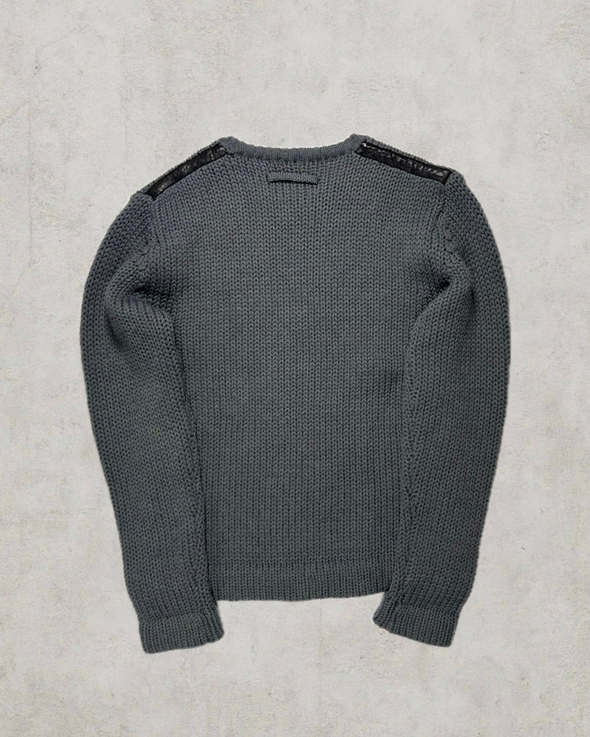 重厚なワッフル編みのボディとショルダー部分にレザー素材の切り替えを施した存在感のあるディティール。軍のコマンドセーターを思わせる構造をベースに、ゴルチエらしい前衛的な解釈を加えたアーカイブ性・希少価値の高い名作。