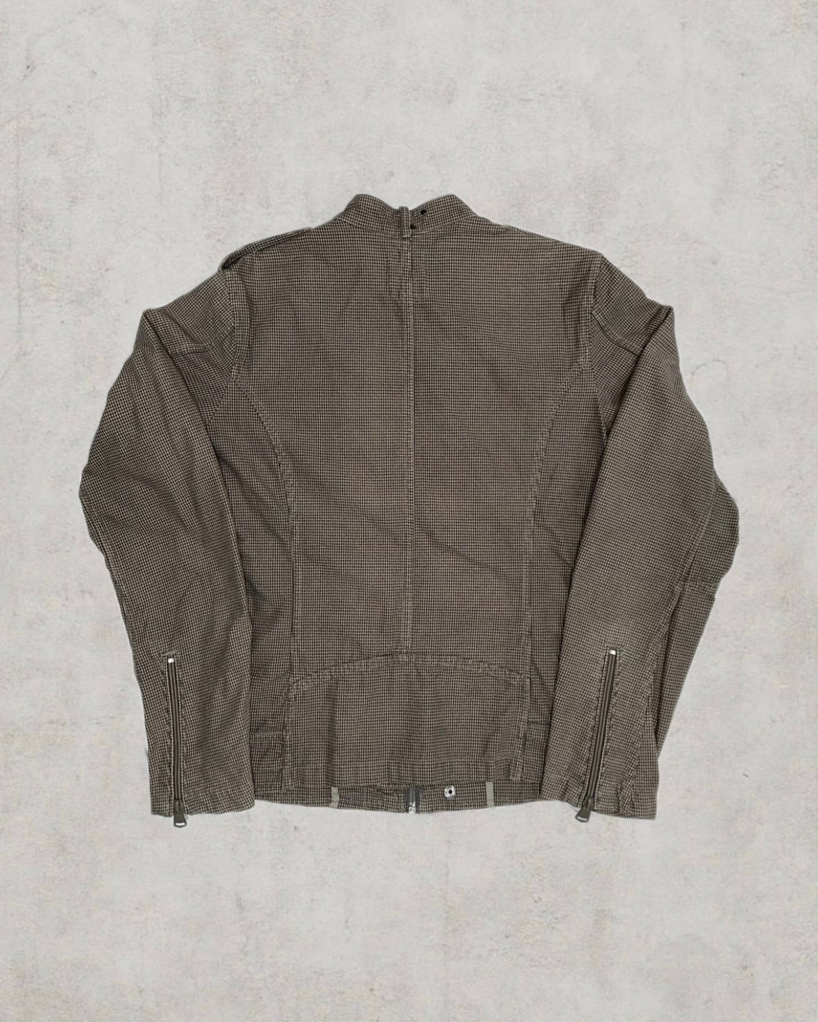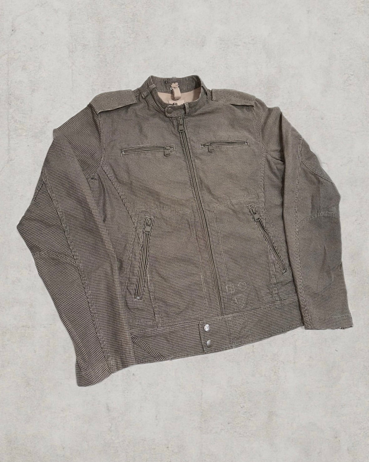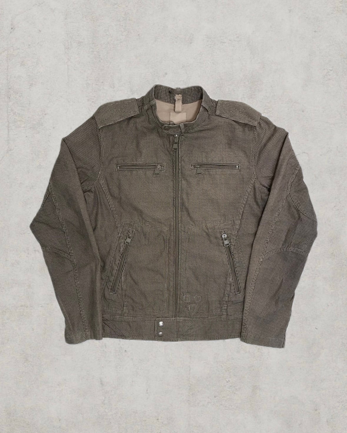 複数のジップポケットと肩章が際立つDIESELのインダストリアルな造形が印象的なピース。陰影を纏う質感がダークウェアらしい存在感を引き立てる。
