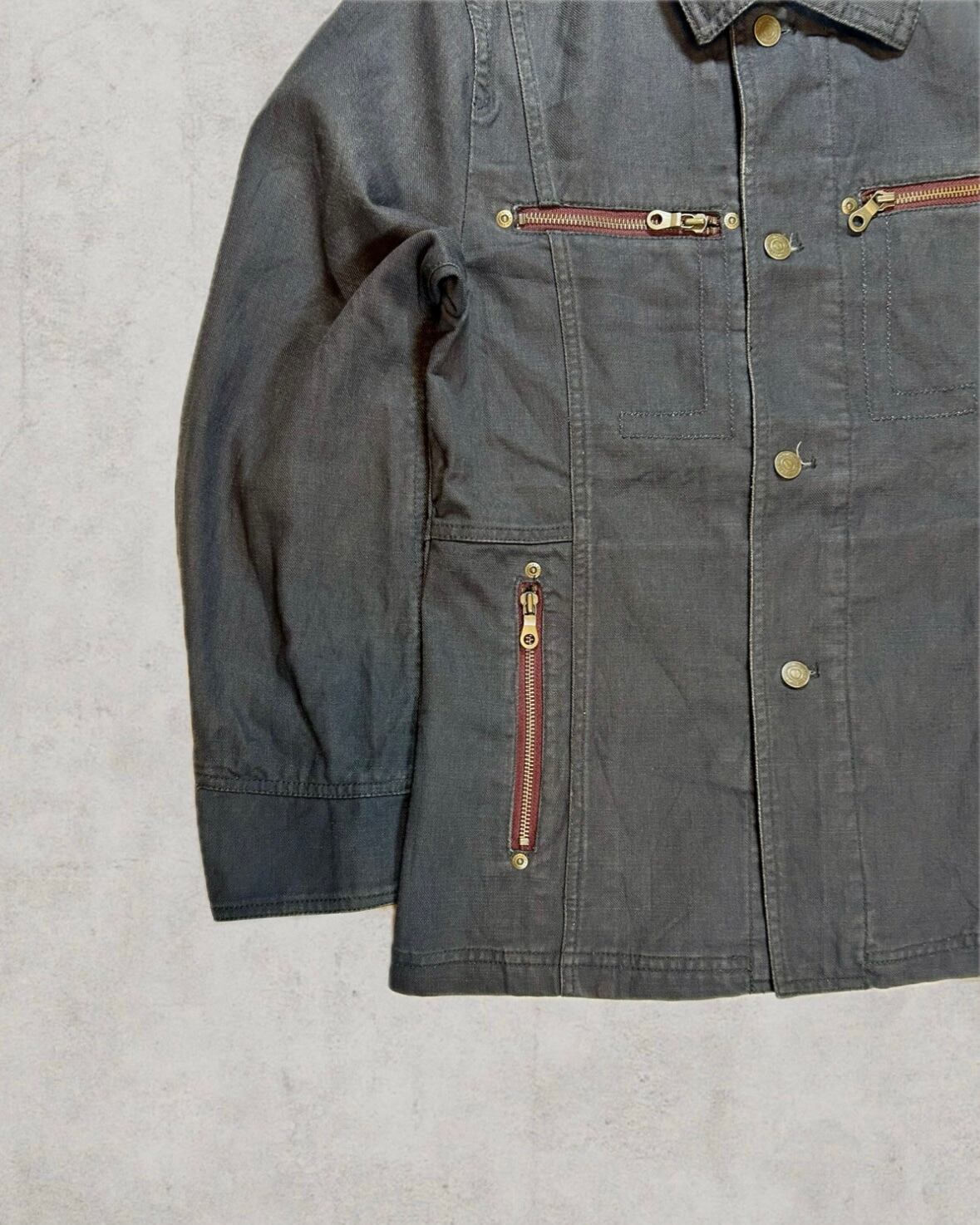 経年によって鈍い光沢を帯びたコットン生地の無骨さとフロント4本のジップポケットの規則的な並びが際立つ。風合い・身体に馴染むサイジングともに完成された逸品。