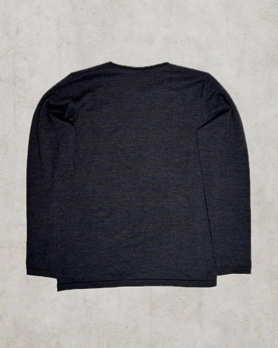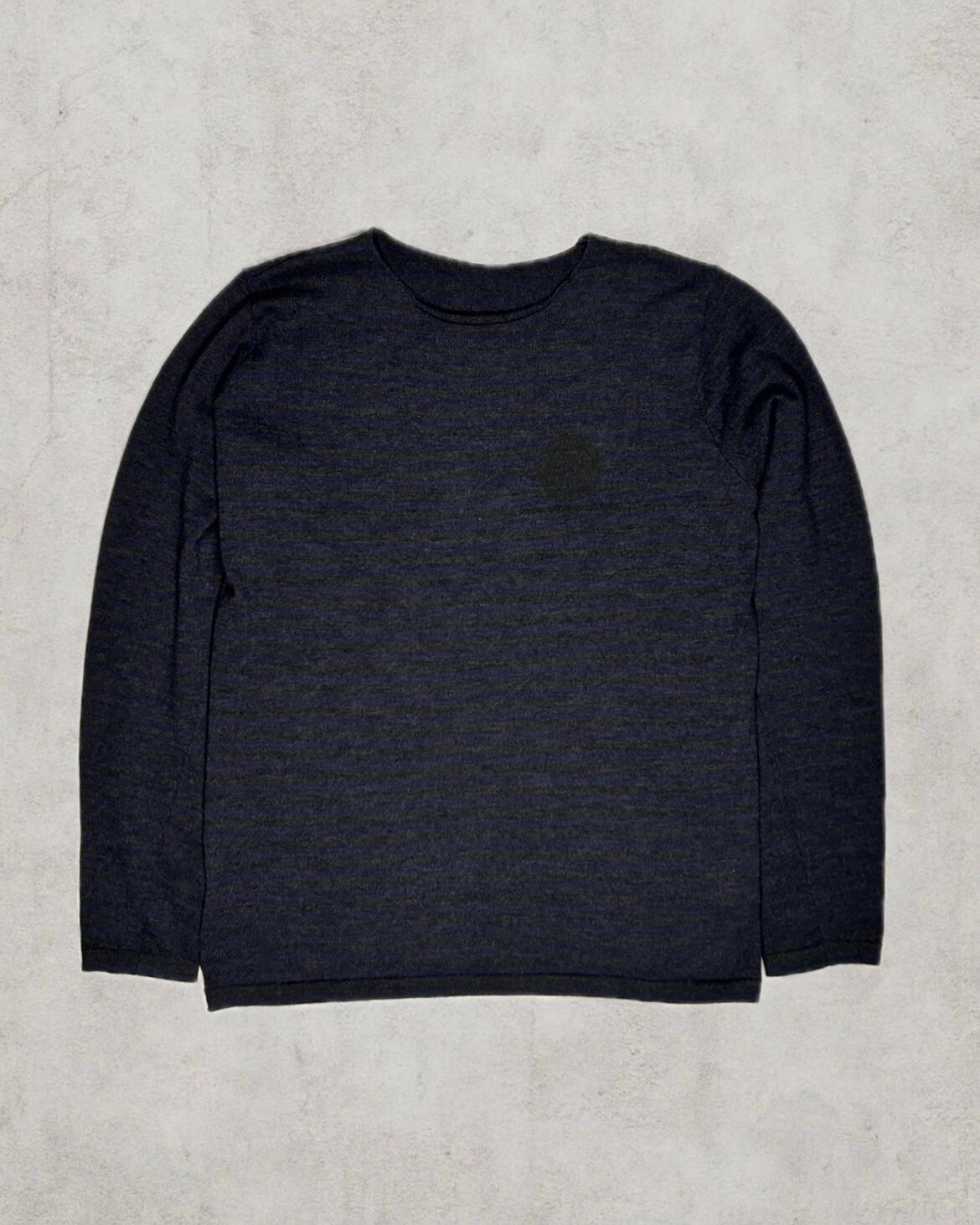 緩やかなネックラインが首元に自然な間を持たせ、ダークブルーの落ち着いたボーダーラインには奥行きを感じる。稀有なスリッドが左右に施され、異彩な空気感を纏った一着。