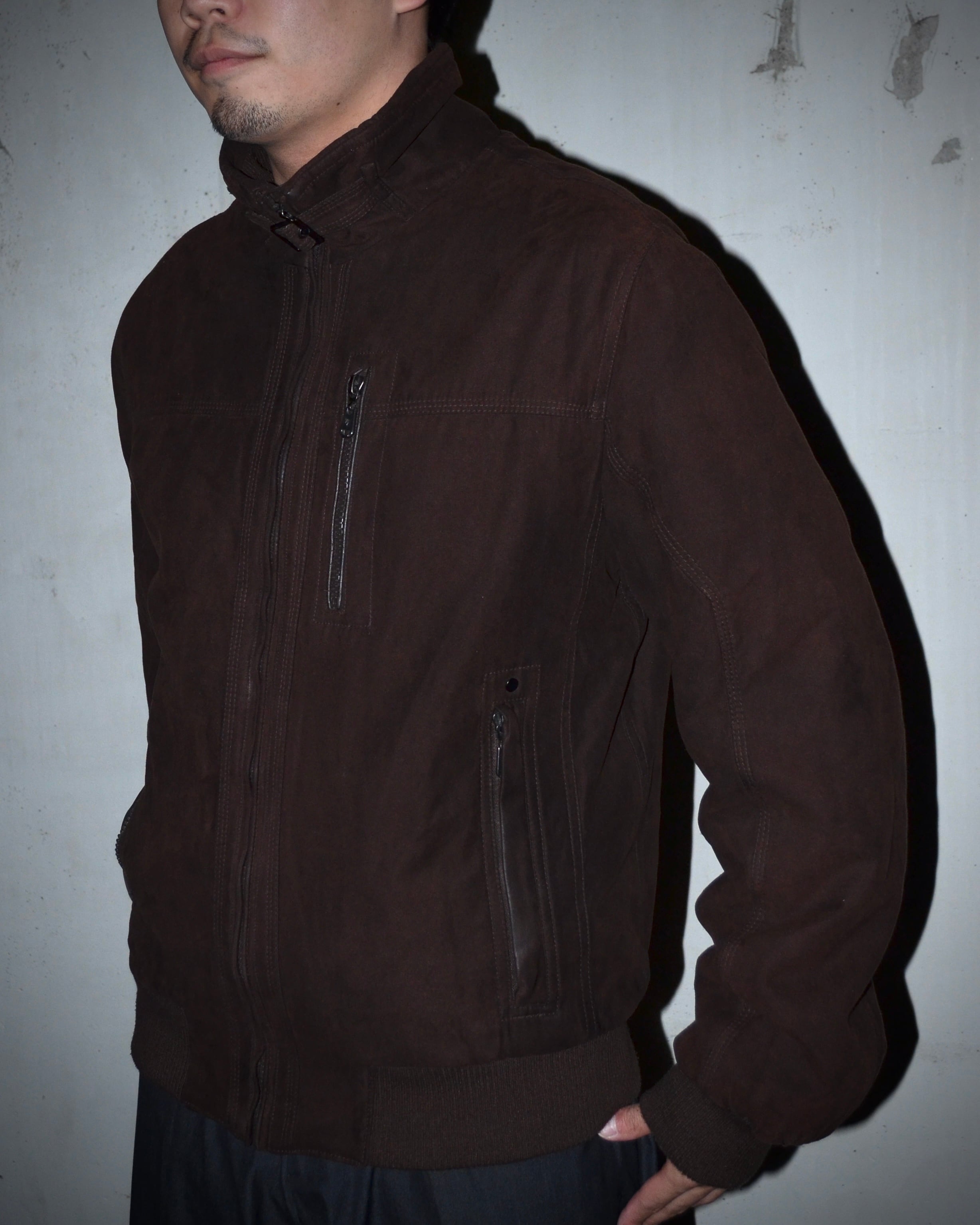 マイクロスエードの柔らかい質感とアーバンテックな要素が絡み合う。深いブラウンに映えるメタルジップやチンベルトが魅力的な一着。
