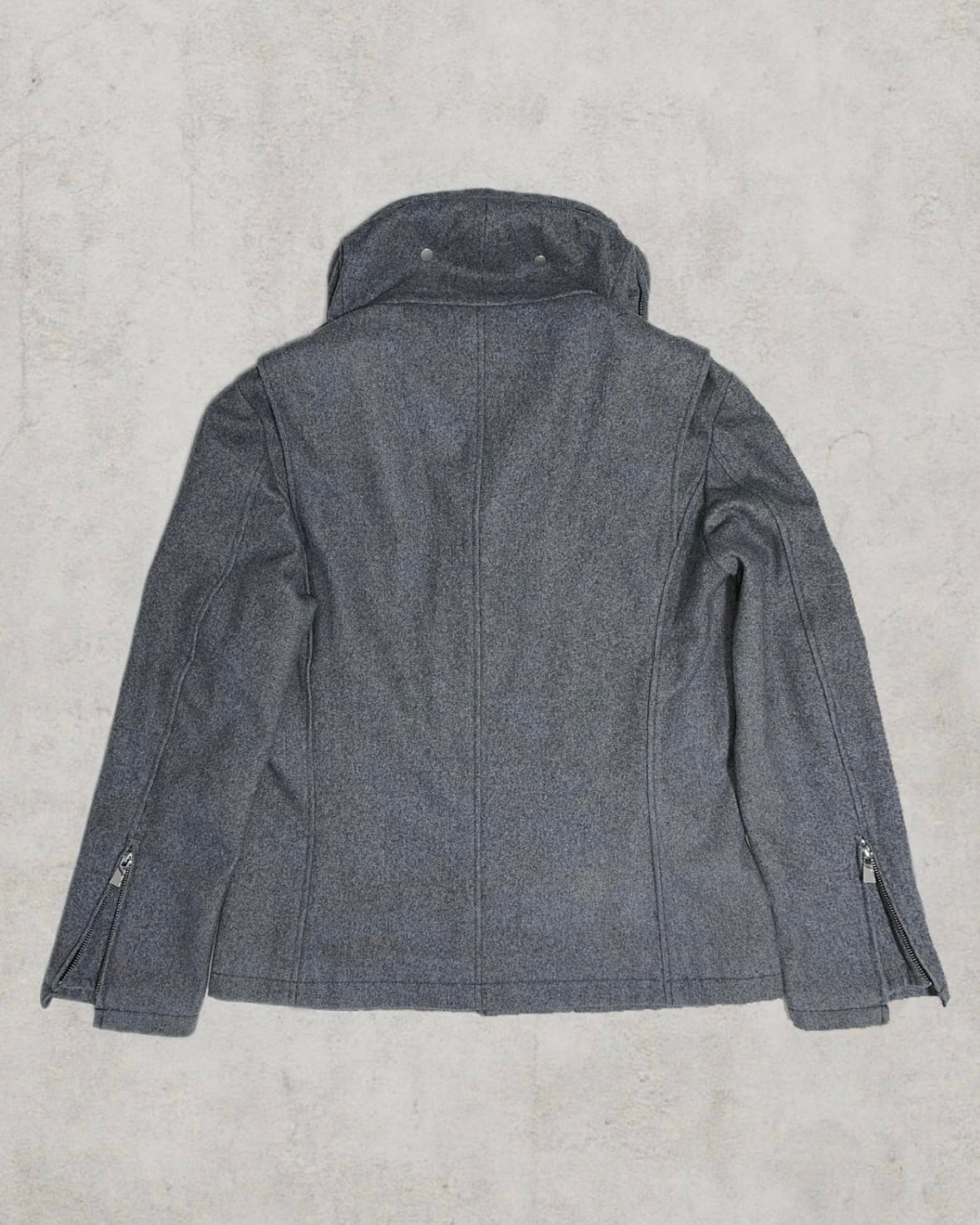 立体的な首元にはフードが収納され、斜めに走るジップをはじめ多彩なギミックを隠したアイテム。都会的かつパターンに囚われない構築が個性を放つ。