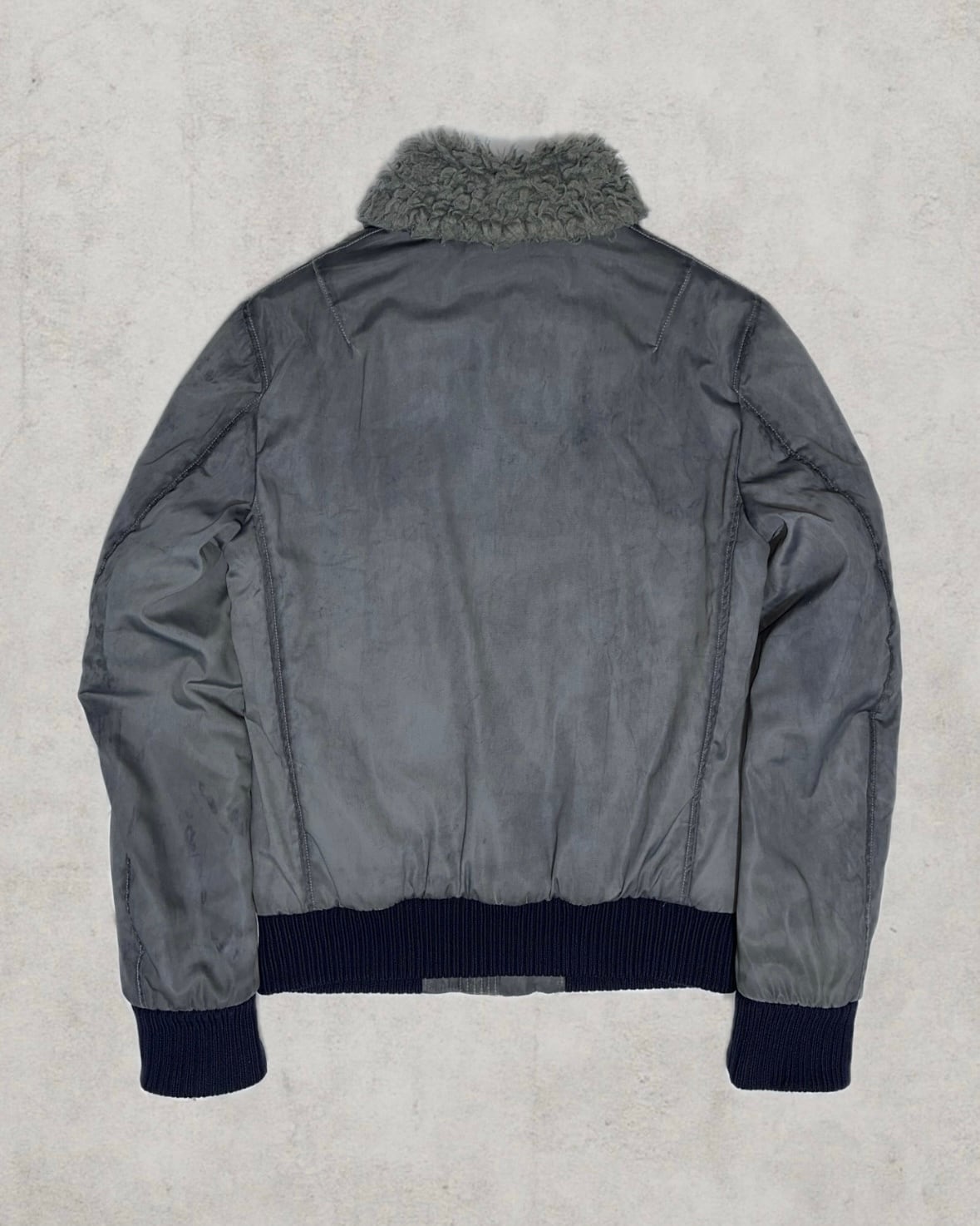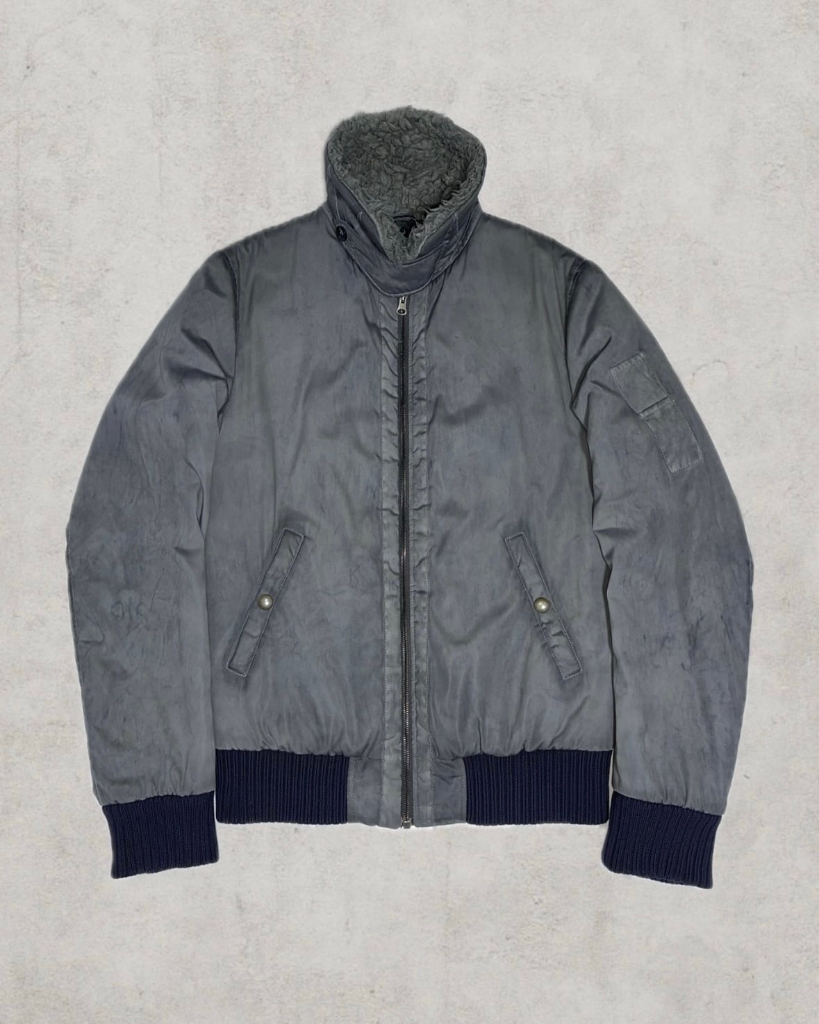 DOLCE&GABBANAでは極稀少な旧型空軍服をベースとした再構築ピースであり、2000年代中期の名作ボンバージャケット。独自のエイジング加工を施した濃淡差のあるテクスチャが存在感を強く放つ。