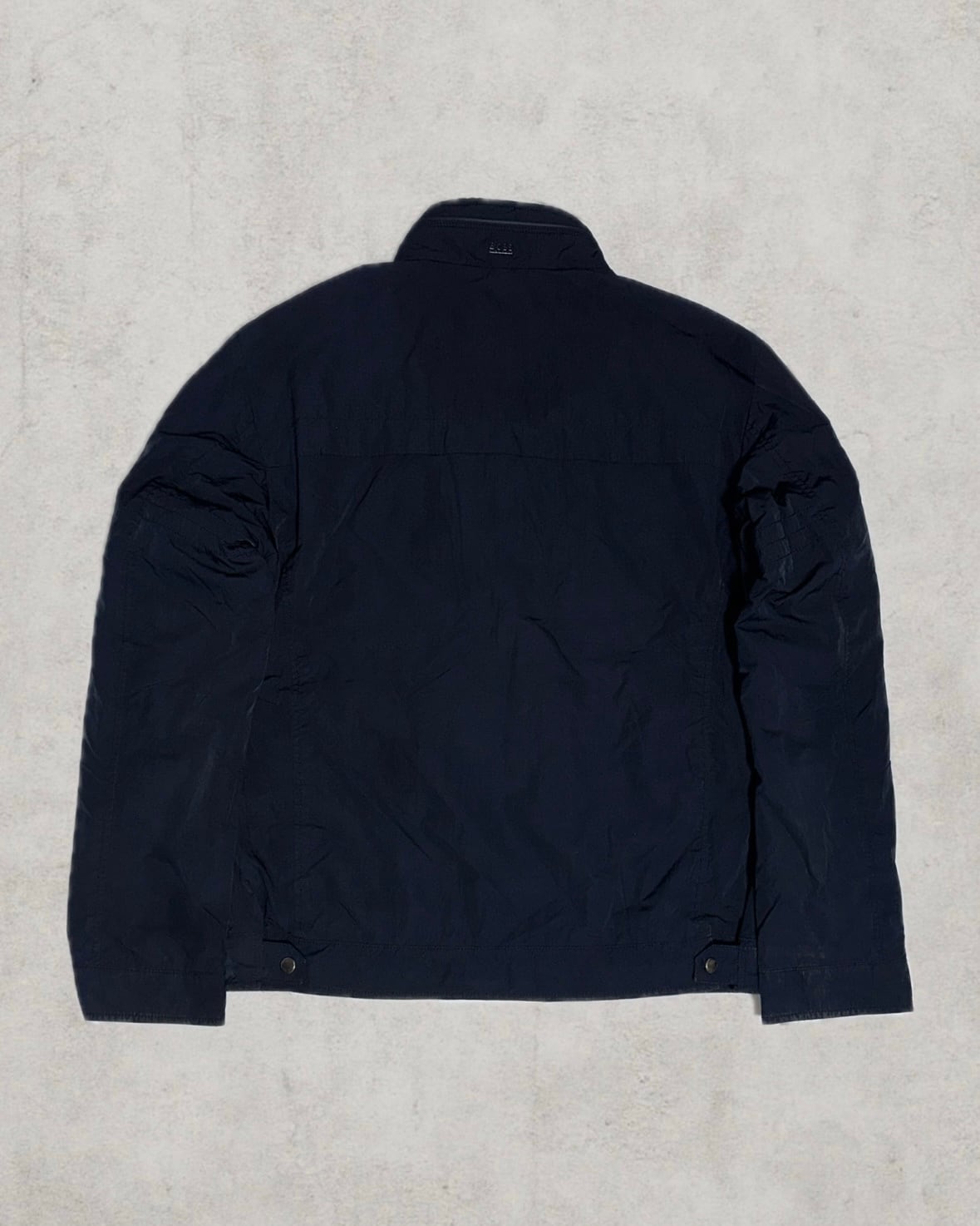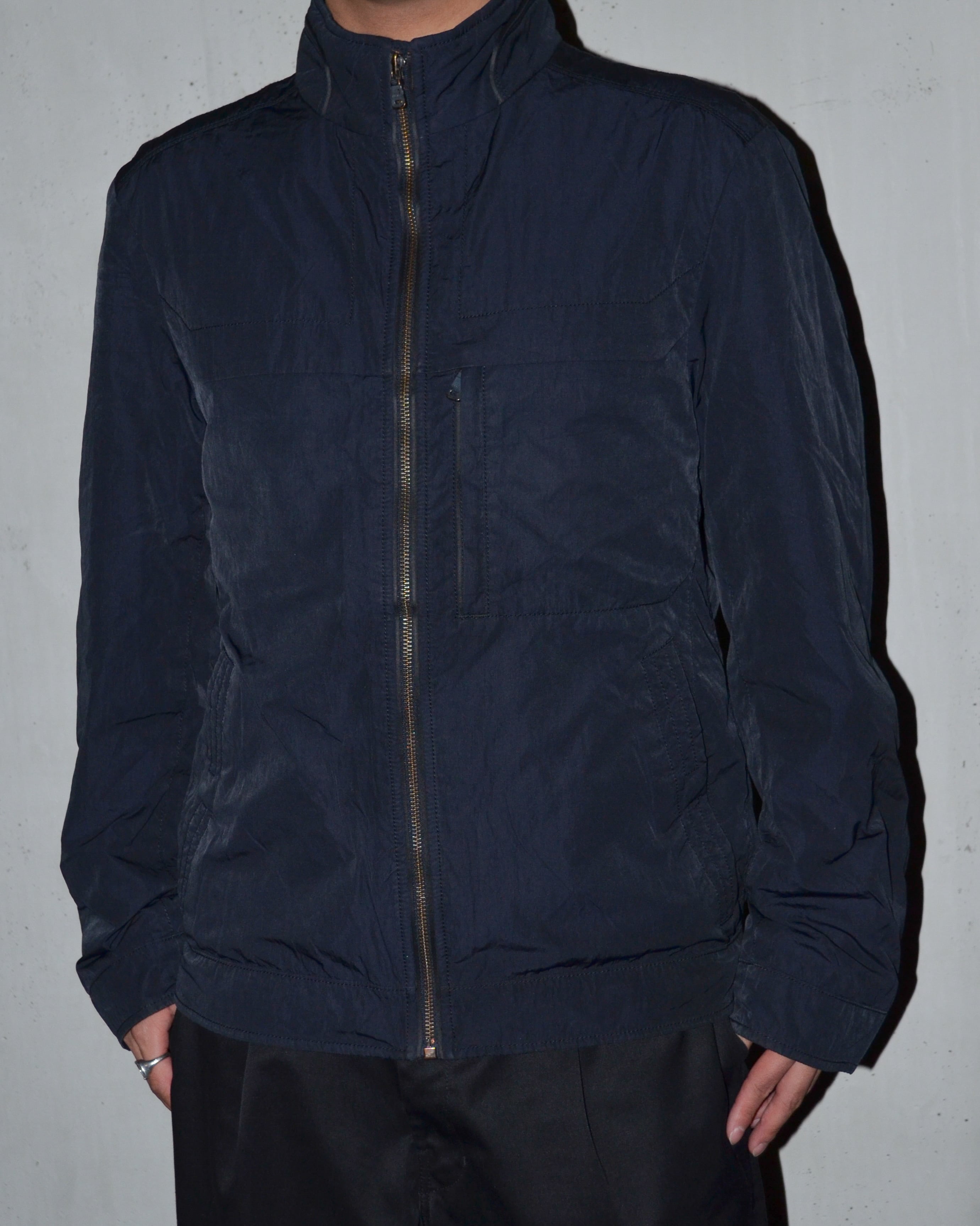 無駄を削ぎ落としたミニマルなジップと首元のパネル仕様のみで表現された一着。マッドな質感のナイロン地に光を僅かに反射するファブリックを組み込んだBOSSらしいコントラストが特徴。