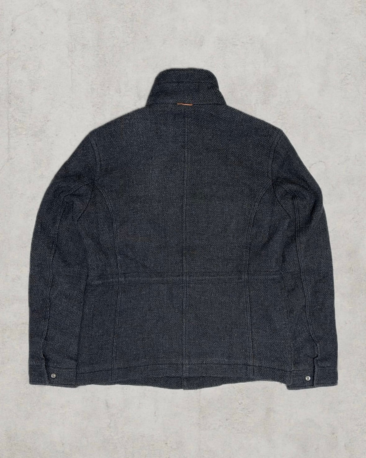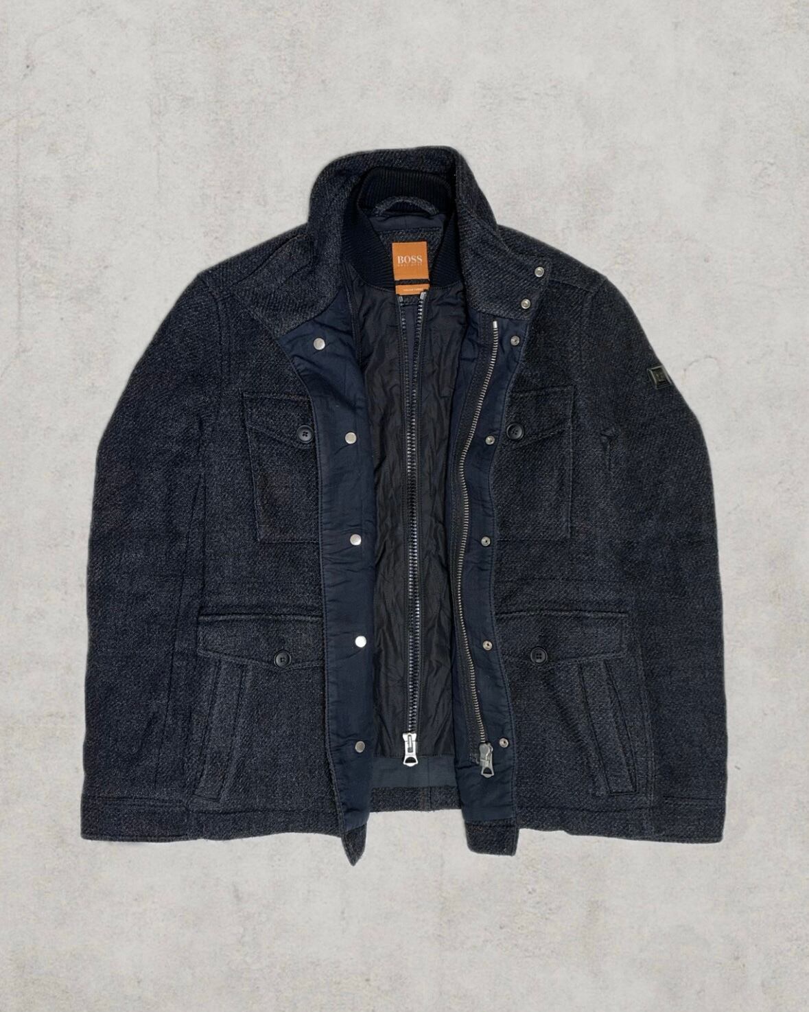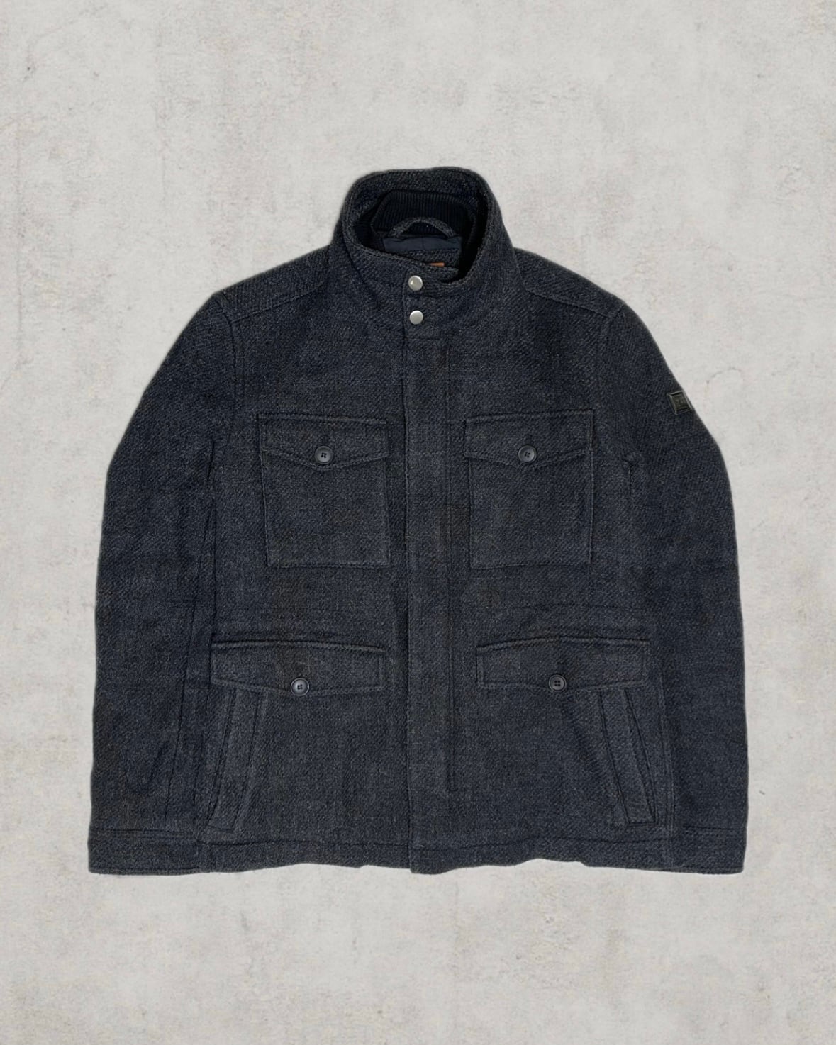 1990–2000年代初期頃のBOSSより、美しい織りのウールが際立つフィールドジャケット。4ポケット構成や着脱可能なインナーレイヤーは機能性とデザインを兼ね備える。イタリア製の厚みあるヘヴィな生地感と肩線の美しいシルエットが魅力。