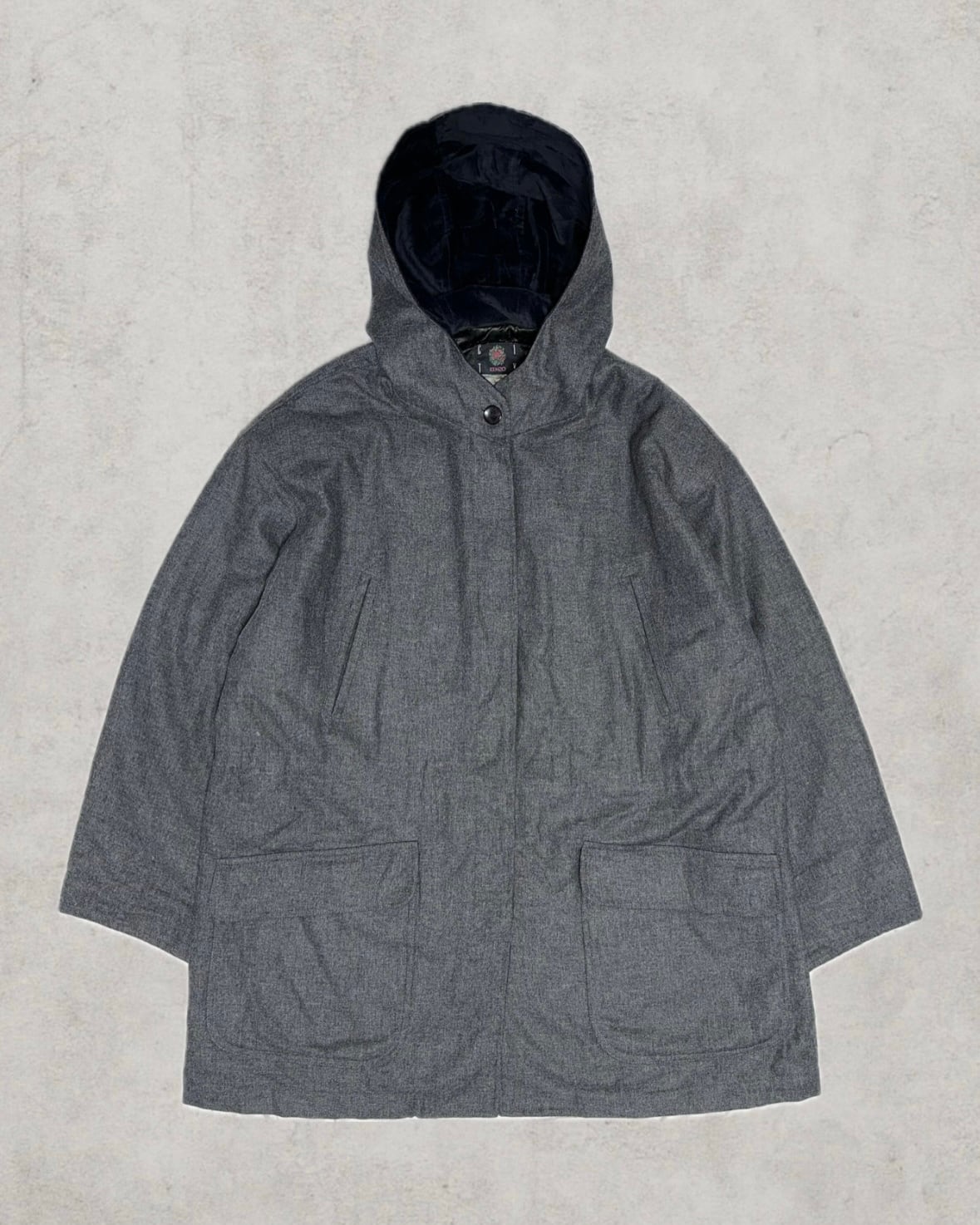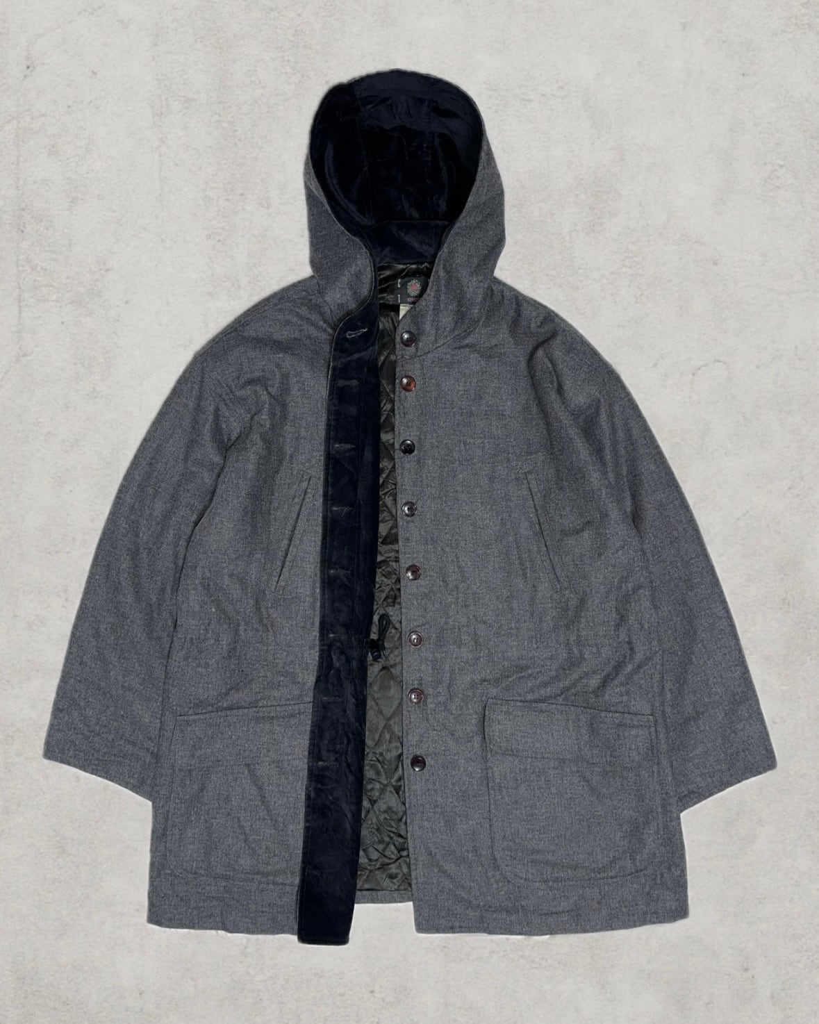 1990年代中期〜後期に生産されたフランス製のKENZO。ベルベット調のフード裏地や比翼ボタンなど細部のこだわりが秀逸なミドルコート。中綿キルティングが施されアウターとして保温性にも優れた一着。