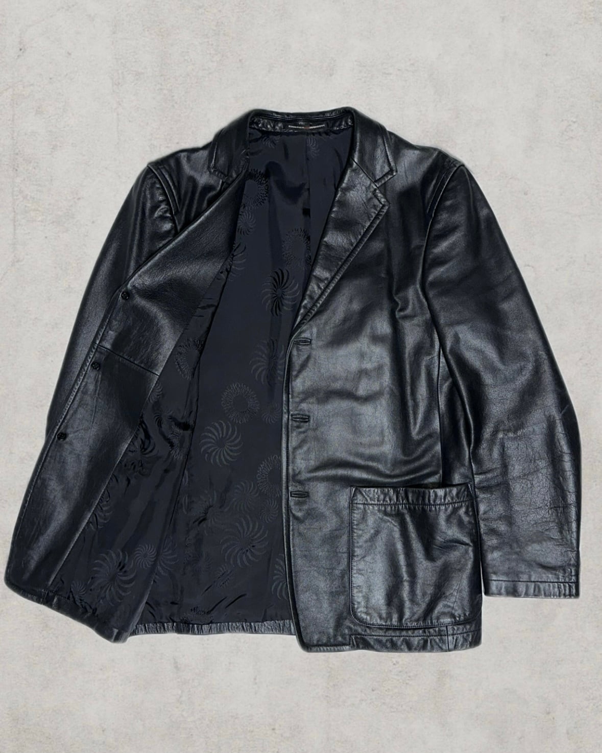 柔らかく上質なブラックレザーでGAULTIER HOMMEの前衛的な構築を表現した90年代後半のピース。大胆なパッチポケットやスパイラルモチーフのライニングなどobjectらしい実験性が落とし込まれた一着。