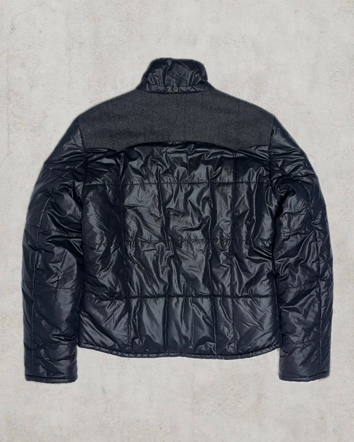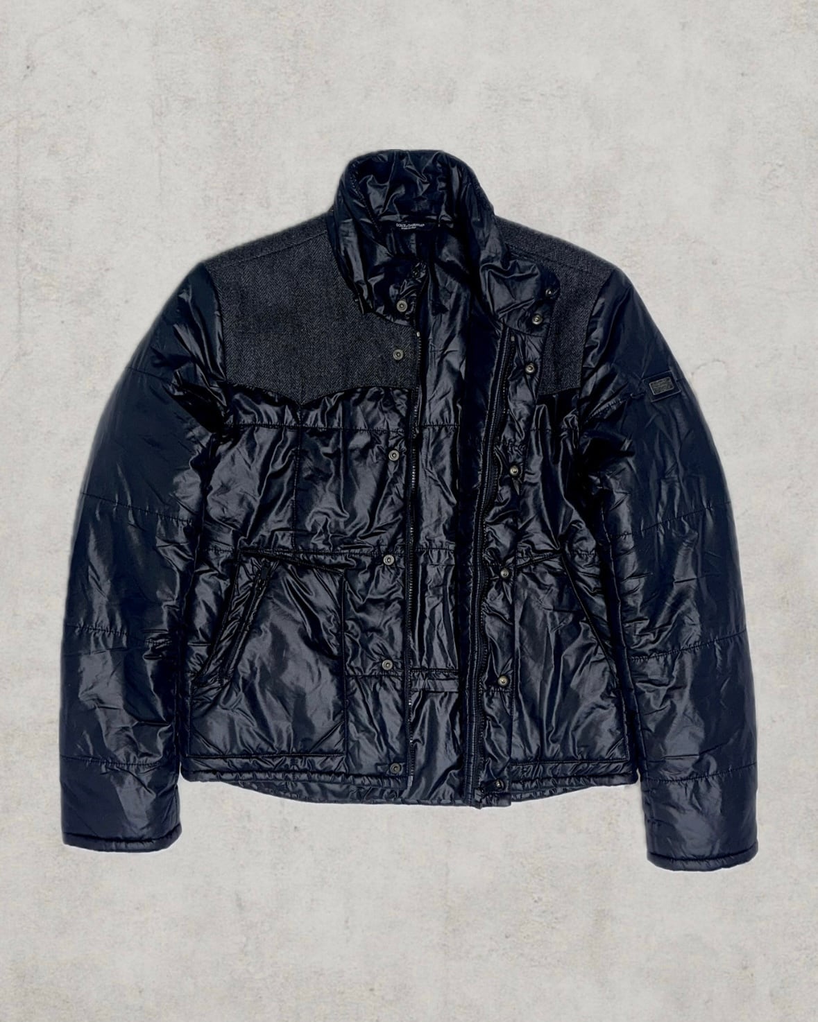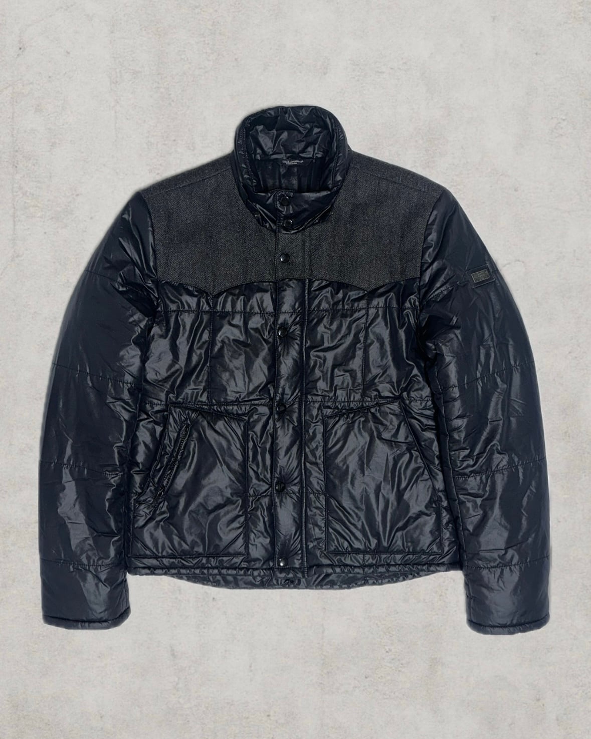 艶やかなナイロンボディにウール素材の切り替えを合わせたパフジャケット。質感のコントラストと二面性を持つシルエットはDOLCE&GABBANAの成熟されたモードを体現している。