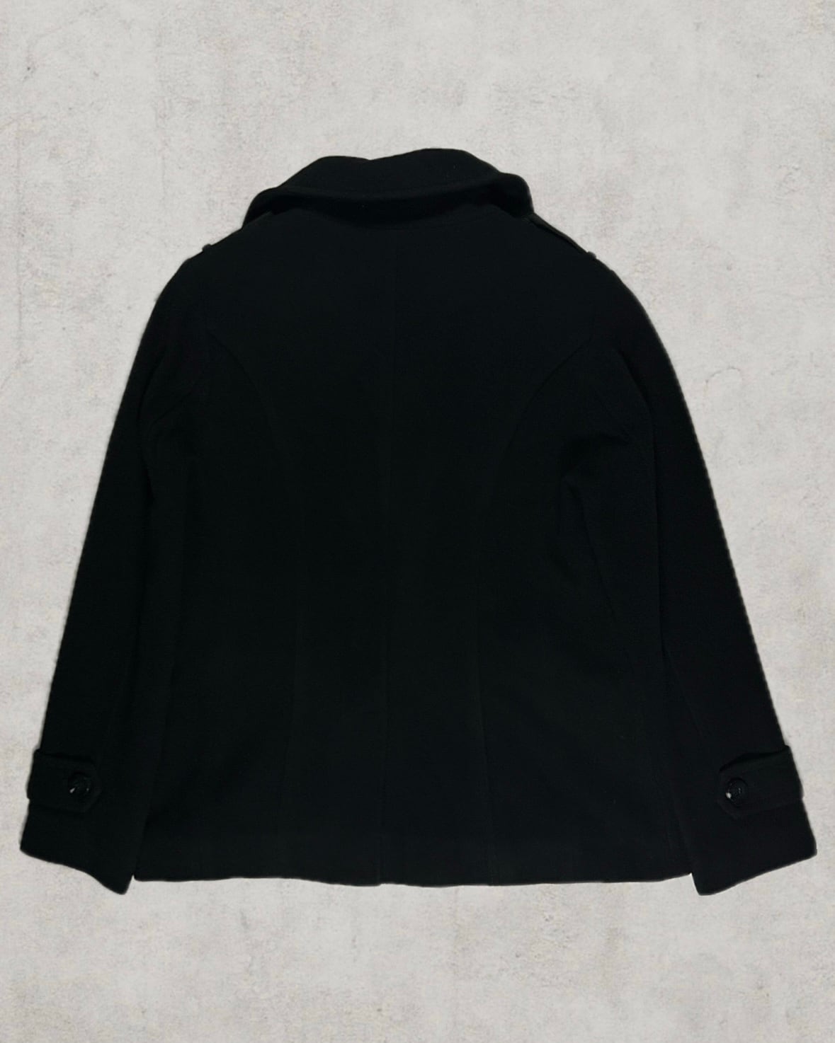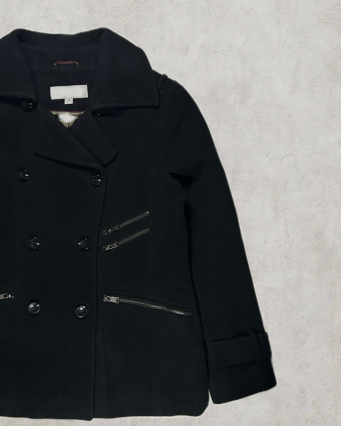 斜めに走る複数のジップを配したピーコート。エポレットやダブルブレストなどのクラシック要素を残しつつ、ギミック性のあるディテールを重ねた、滅多に出てくることがないアヴァンギャルドな逸品。