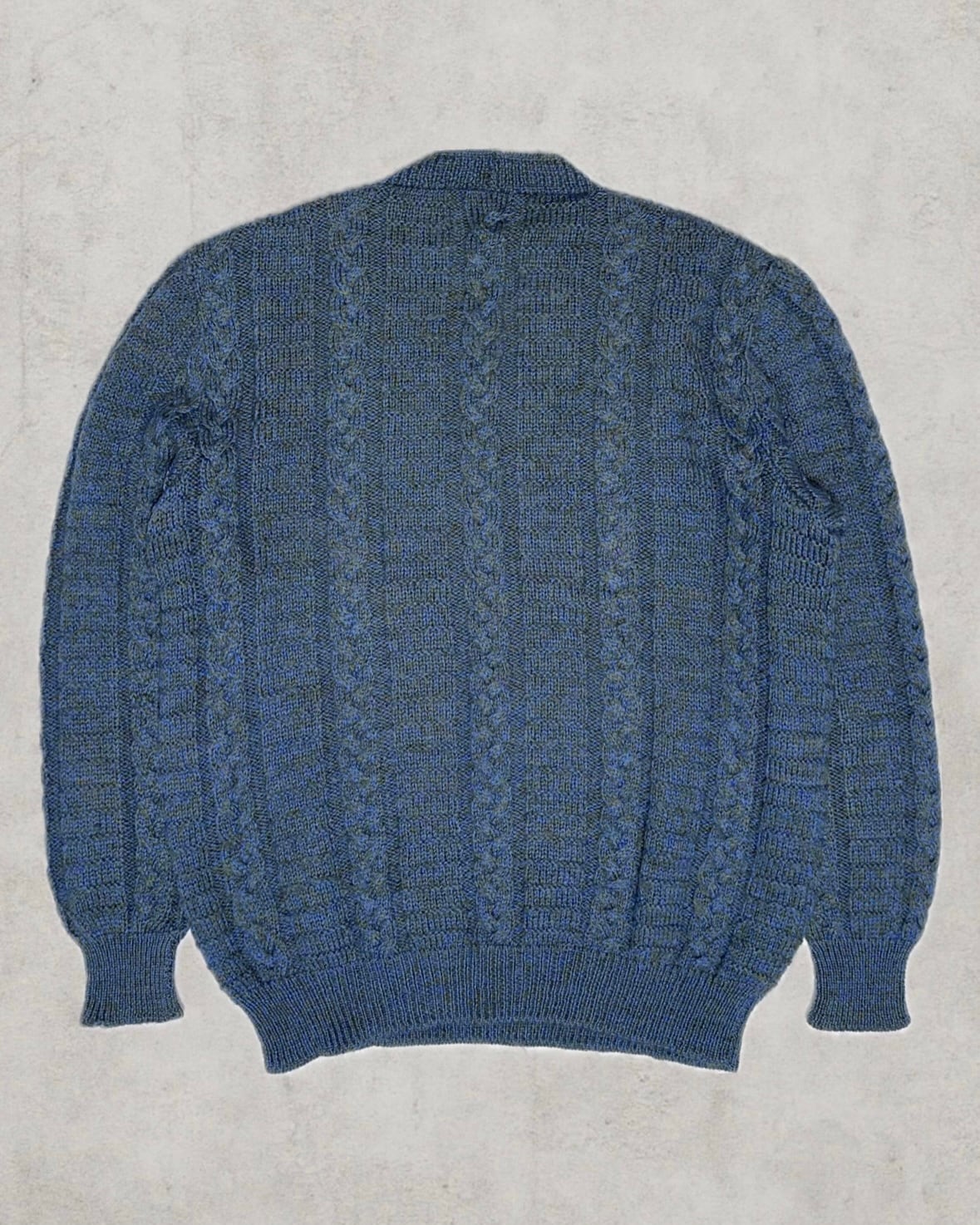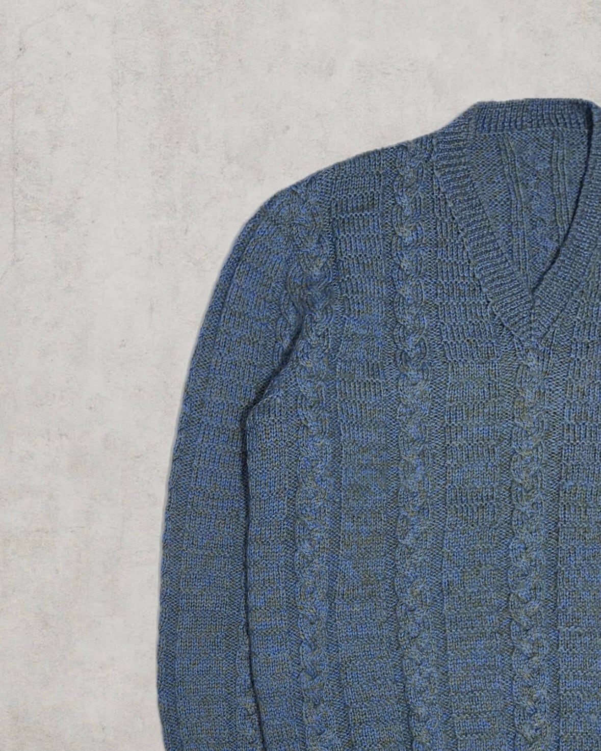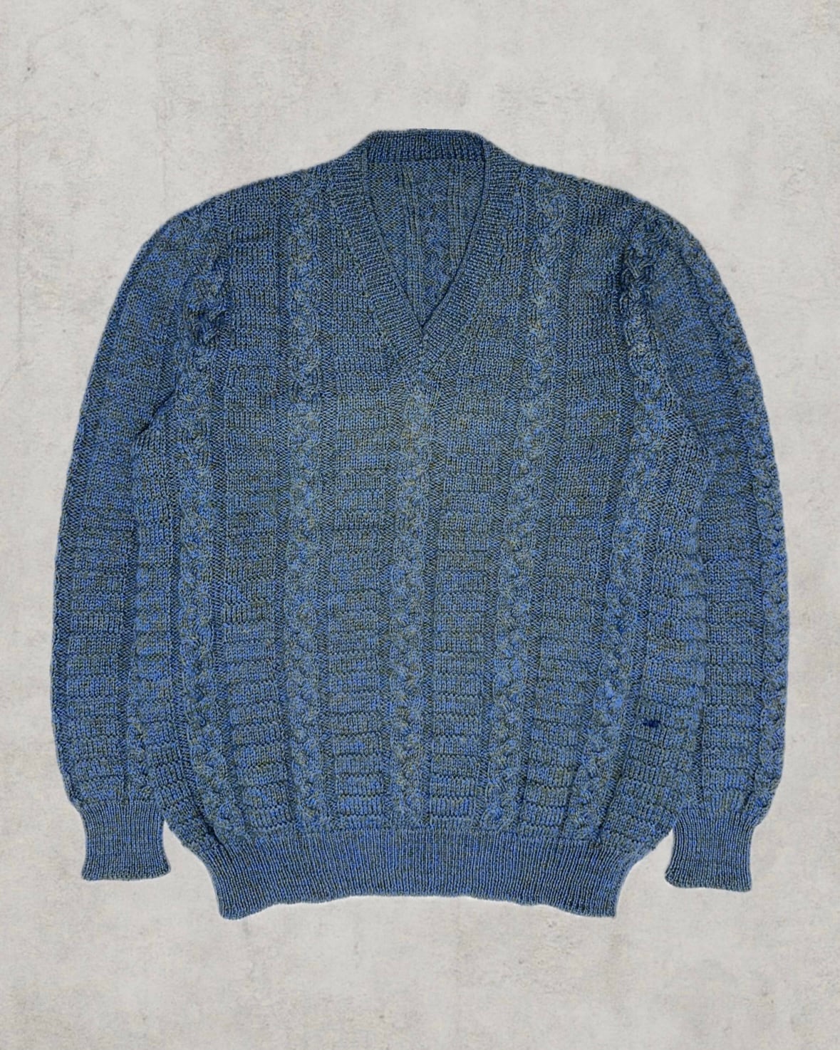 深いブルーを基調に、霜が差したようなメランジ表情で編み立てられたヴィンテージニット。汎用性の高い一枚で、モードな雰囲気にエッセンスを加えたい方へ。