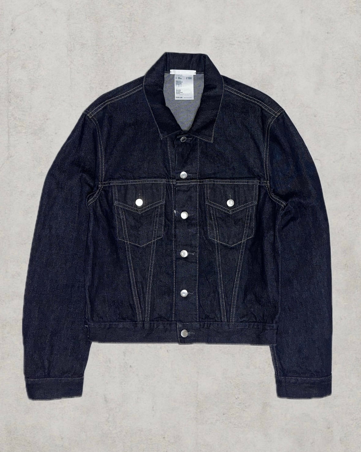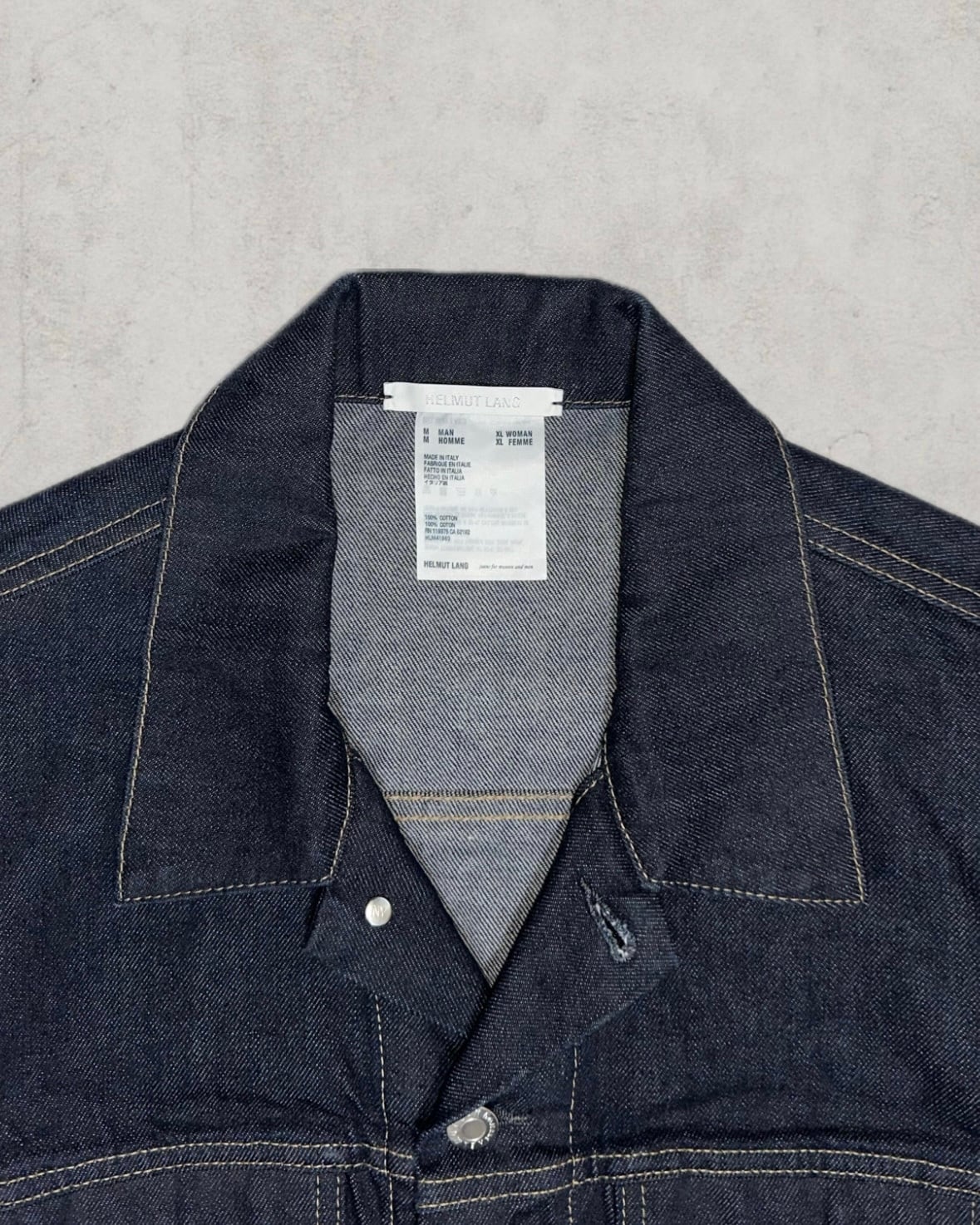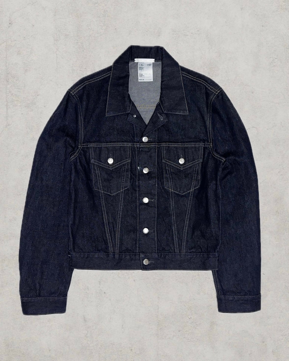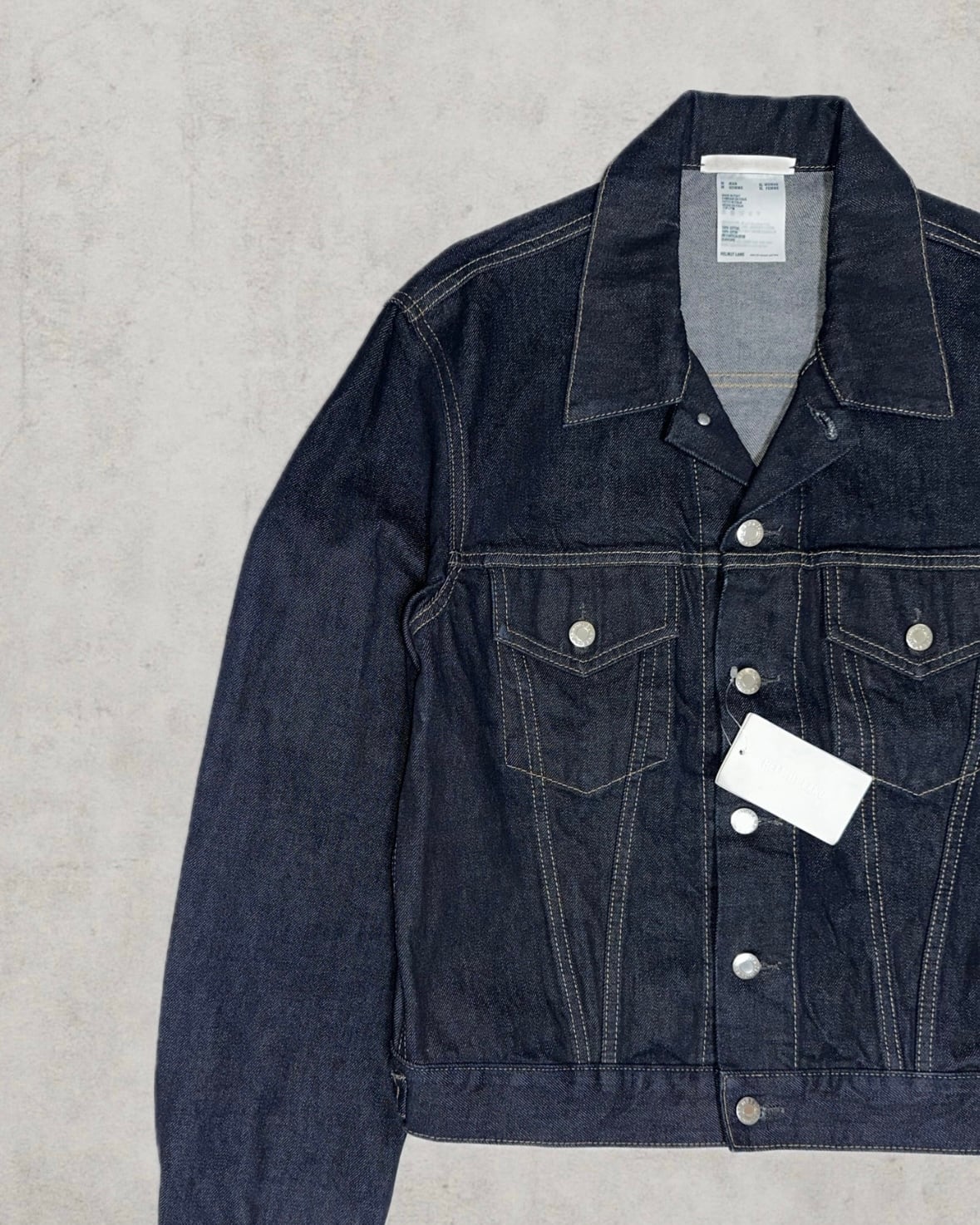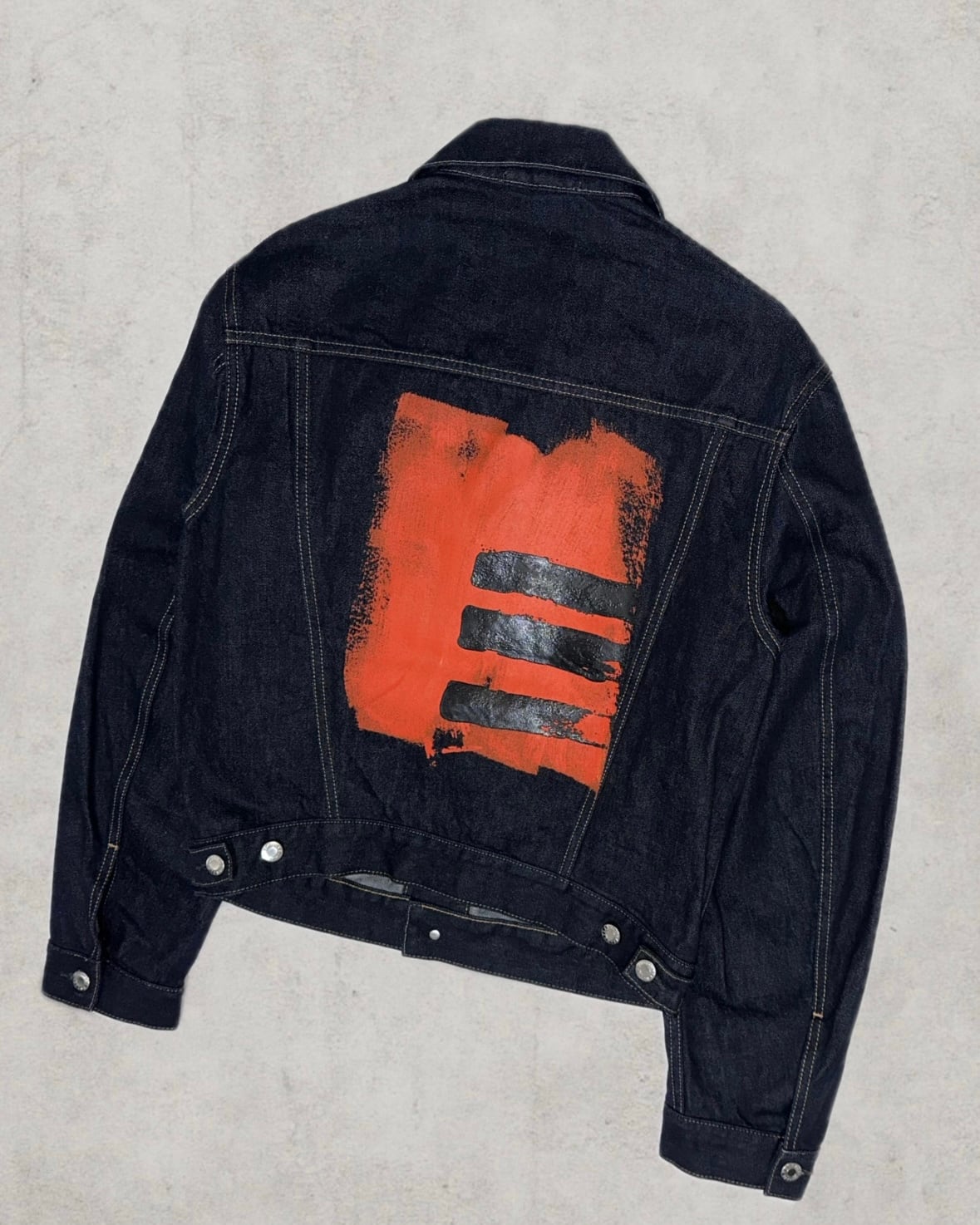 Made in ItalyのHelmut Langより背面に大胆なペンキアートを配した象徴的なアーカイブピース。Josephine Meckseperのハンドペイントとリジットデニムが当時のまま保管されたDeadstock個体。市場には滅多に出回らないゴールデンサイズ&コレクターの中でも特に評価の高い名作トラッカージャケット。