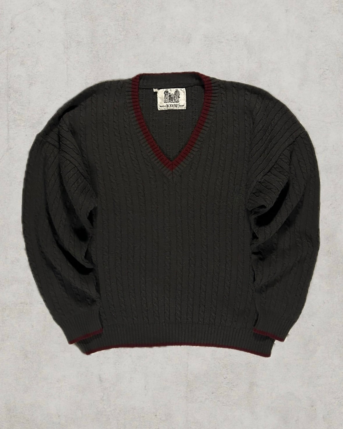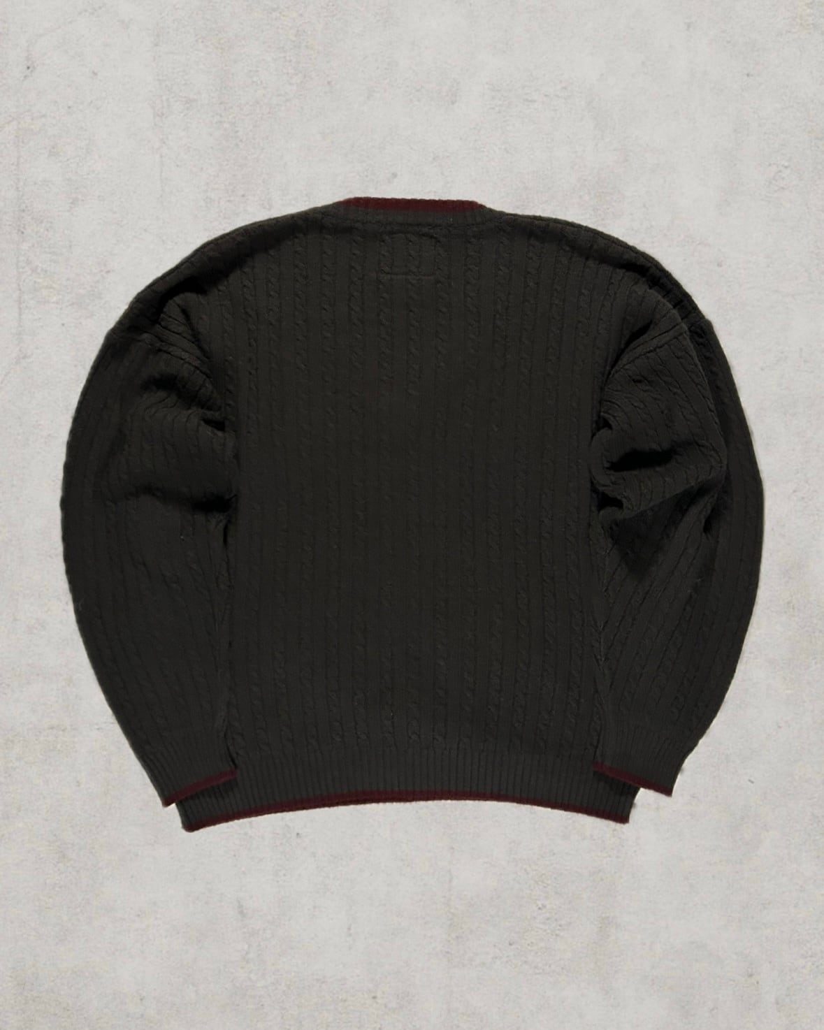 落ち着いた色味のボディに、深みのあるバーガンディのトリムを配したVネックニット。