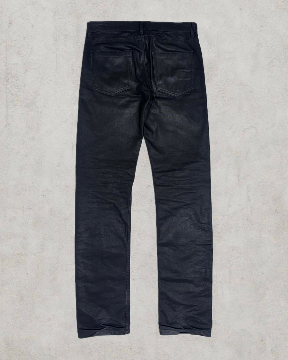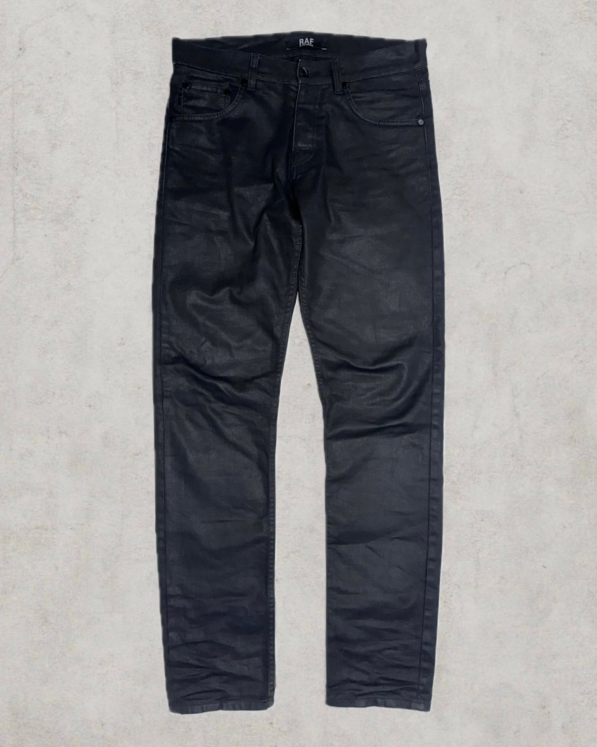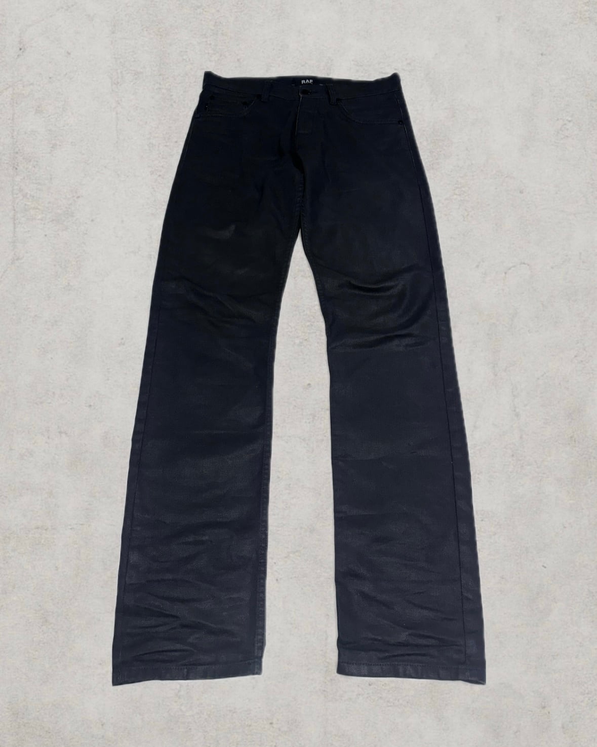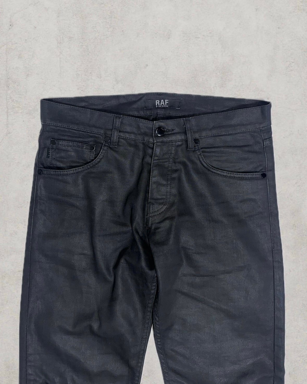 RAF by RAF SIMONSによる希少なイタリア製コーティングデニム。ブラックデニムに施された表面加工は全面状態が良く、今後経年によって自然なムラ感を生む。立体感のあるスリムストレートで引き締まった印象と無骨な存在感を残した名作。