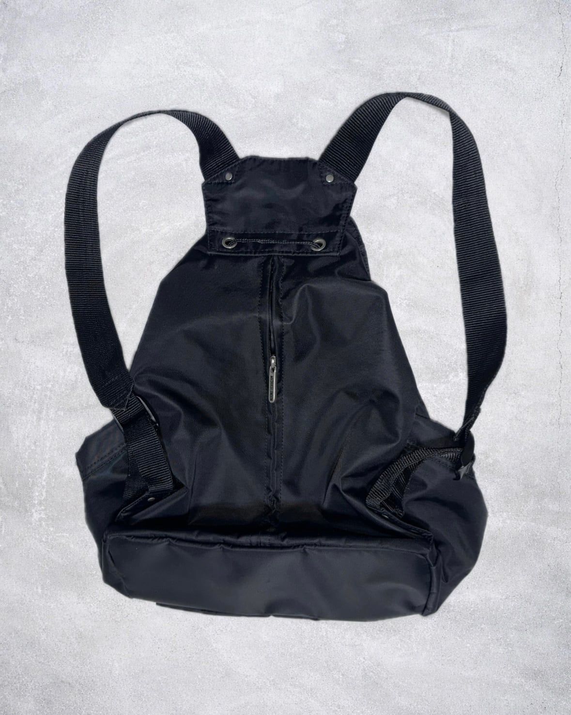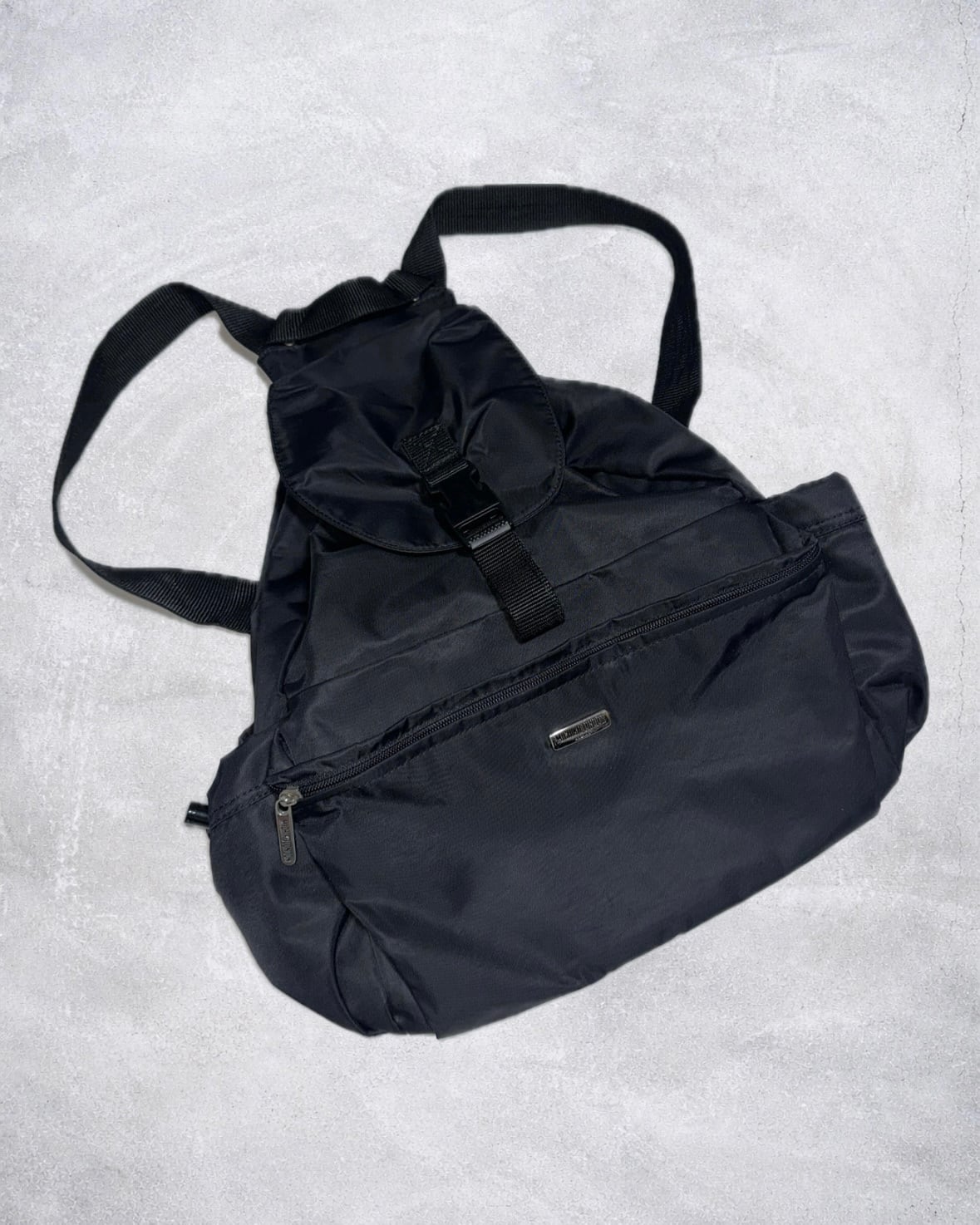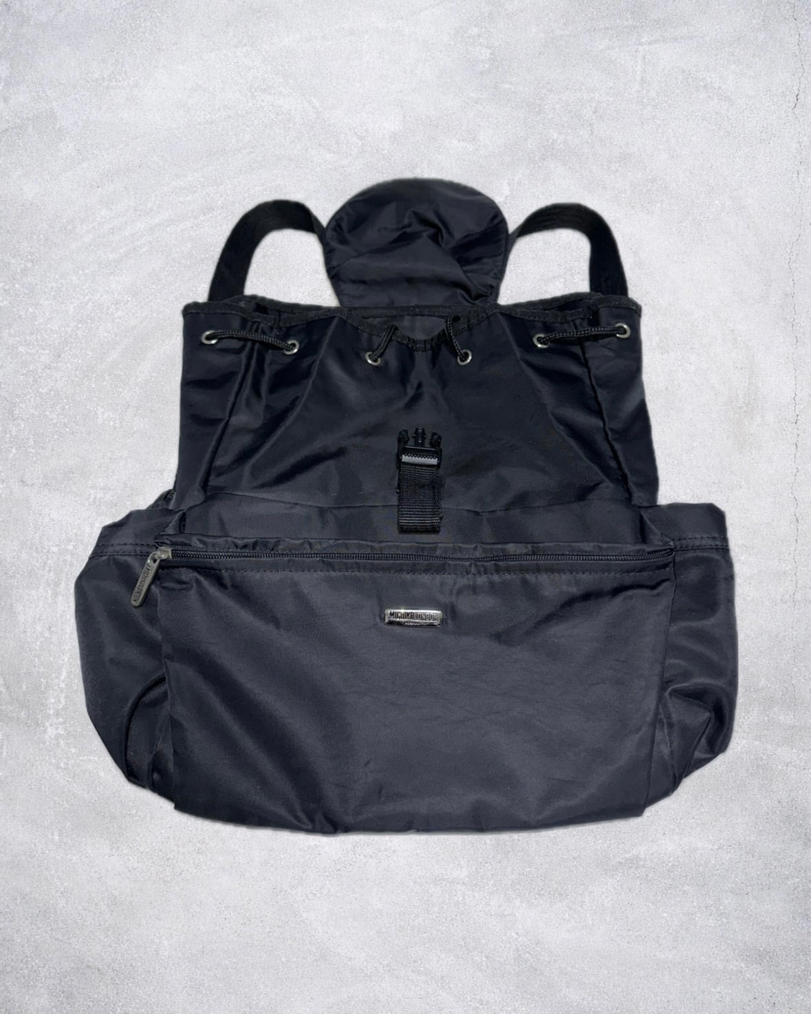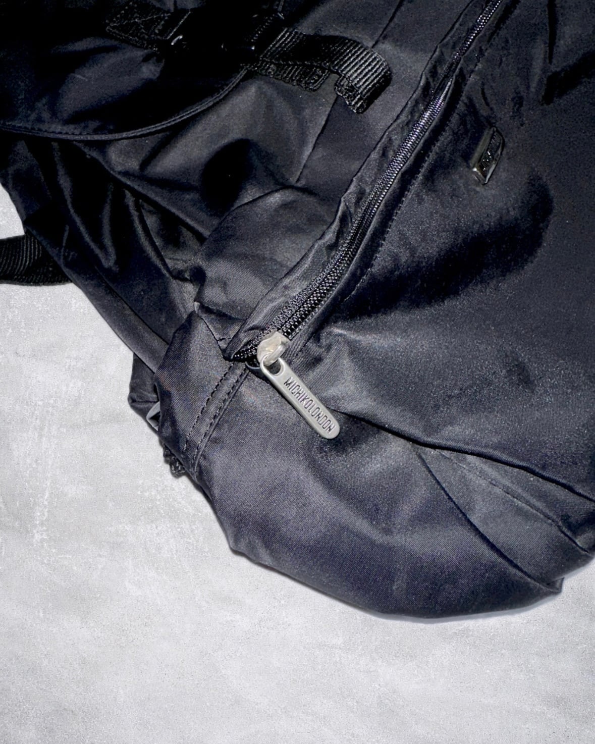 モードテックな空気感を纏うMICHIKO LONDON KOSHINOのバックパック。ワントーンブラックのミニマルな佇まいにナイロン特有の光沢が重なり、スタイリングの外しとしても重宝するユーティリティピース。