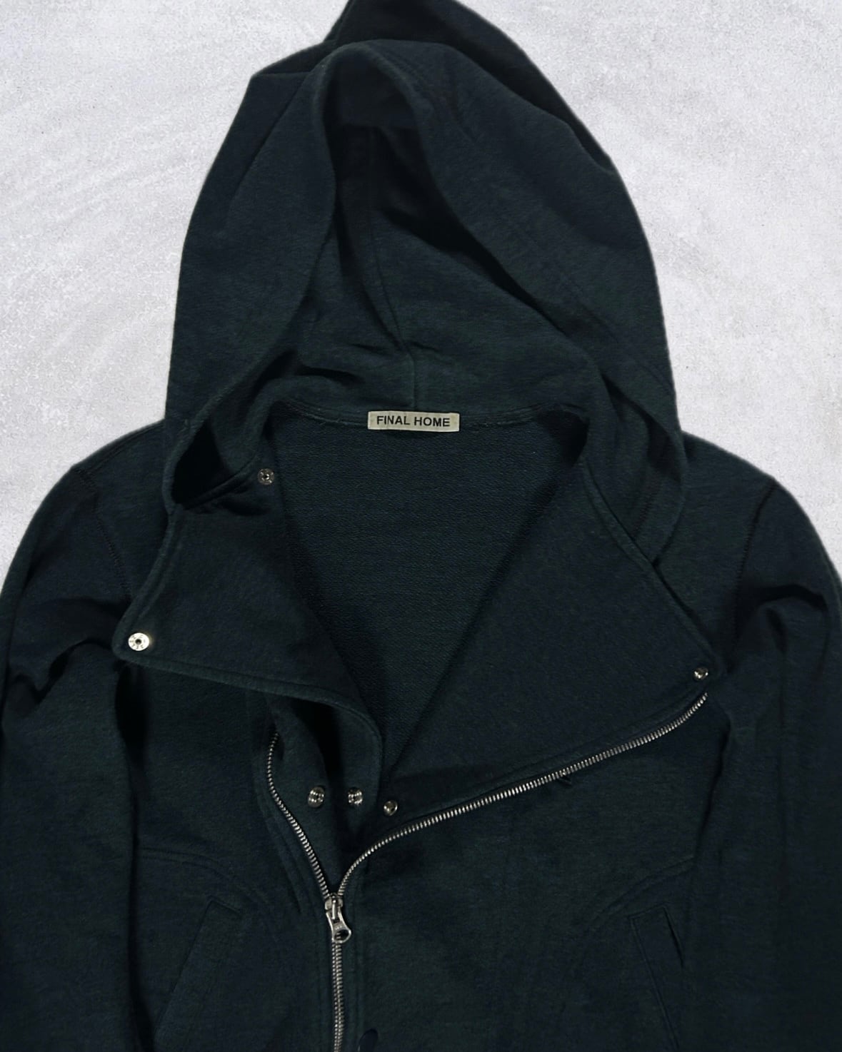 2000年代前後のFINAL HOME。都市的でありながら00sアーカイブの陰に隠れた構造美がフロントに散りばめられている。斜めに走るジップとスナップのレイヤードは空気を一変させる。