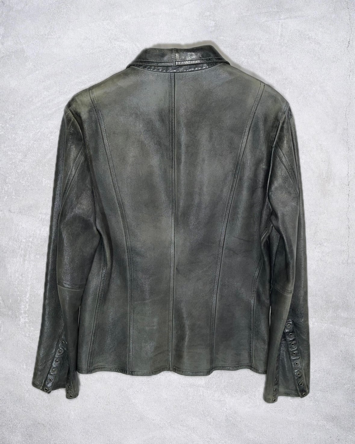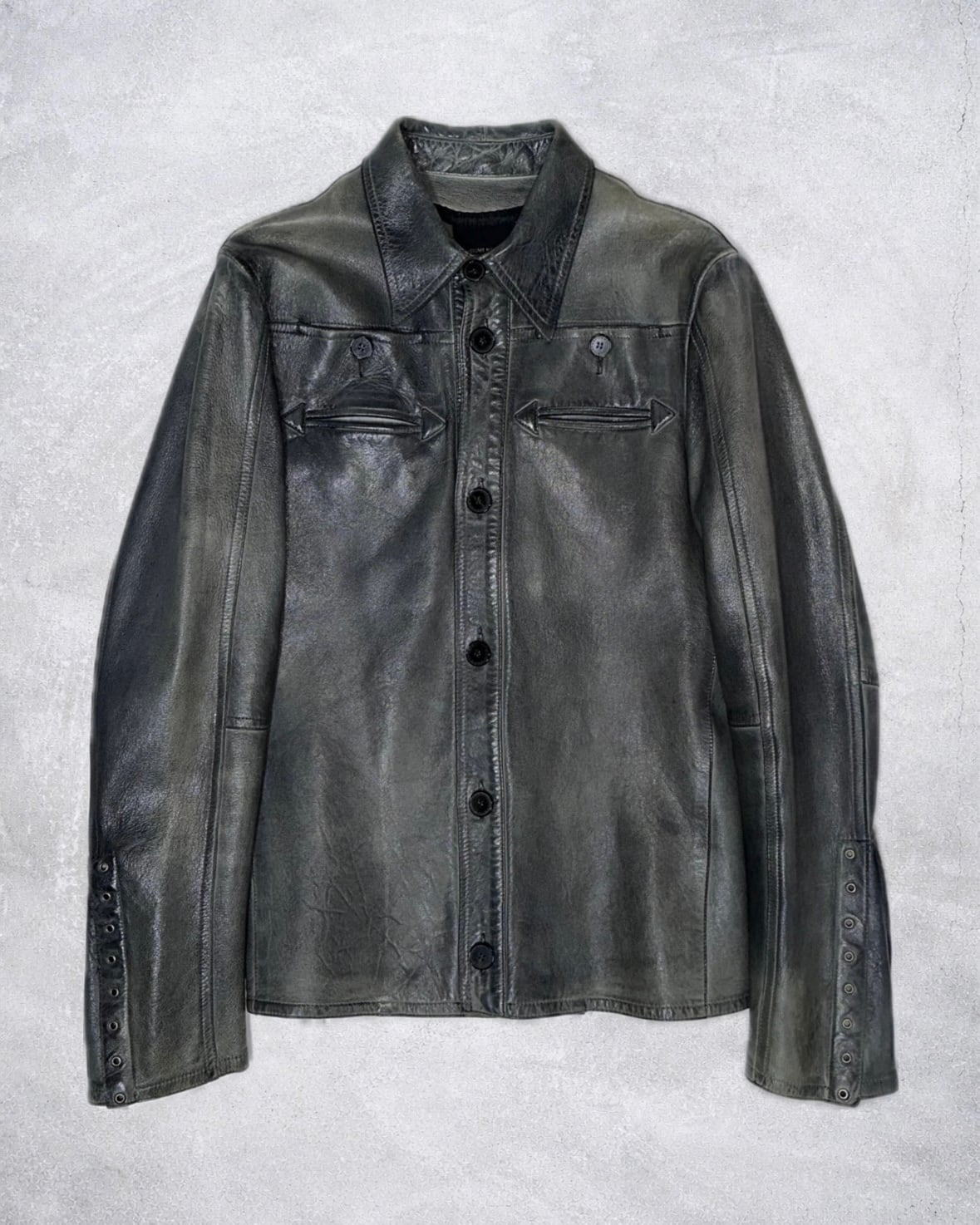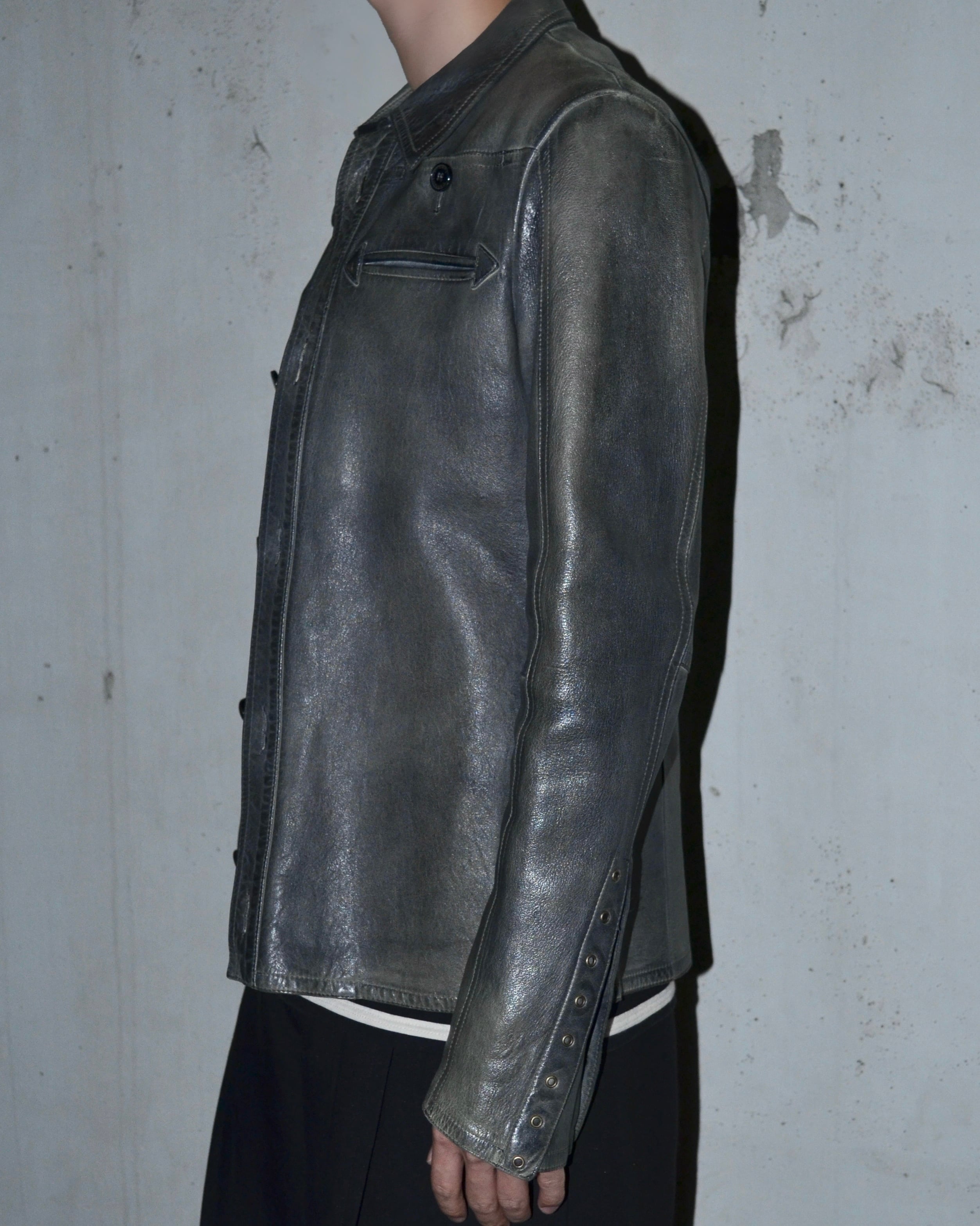 90年代イタリアのミニマルモードを代表するCoSTUME NATIONAL HOMMEによるレザージャケット。アローポケットや袖に施されたアイレットがエッジを効かせている。落ち着いたダークトーンと経年によるレザーのフェードが相まって90sアーカイブの存在感を強く放っている。