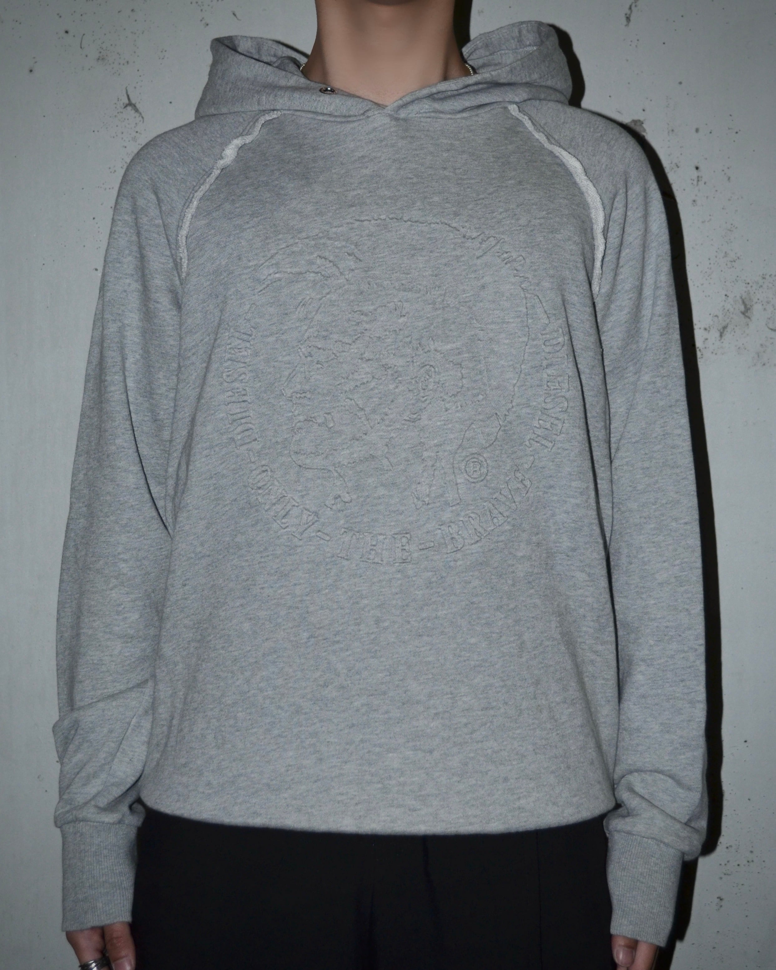 2000年代前半から中期頃のDIESELによるエンボスフーディ。生地を内側から押し出すことで凹凸のあるデザインに仕上げた一着。ラグランスリーブが絶妙な落ち感を生み、肩のカットオフはモードに僅かなエッセンスを加える。
