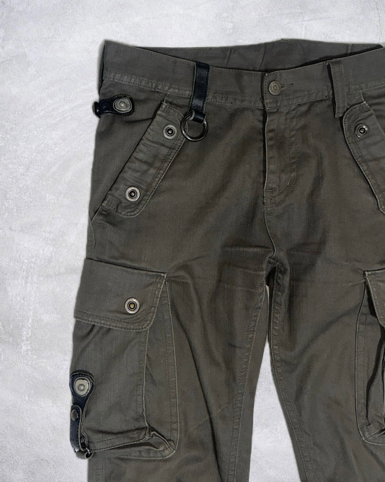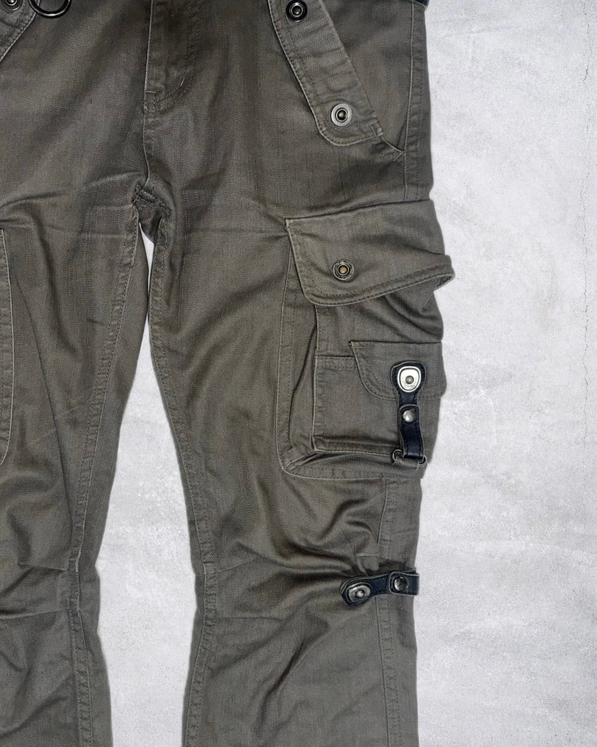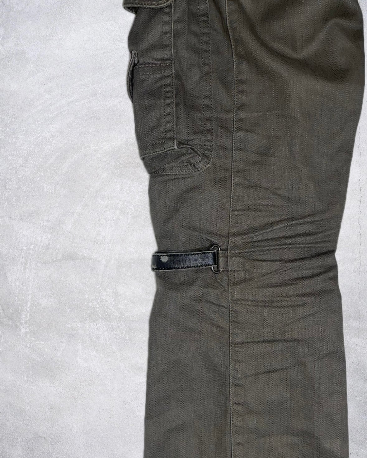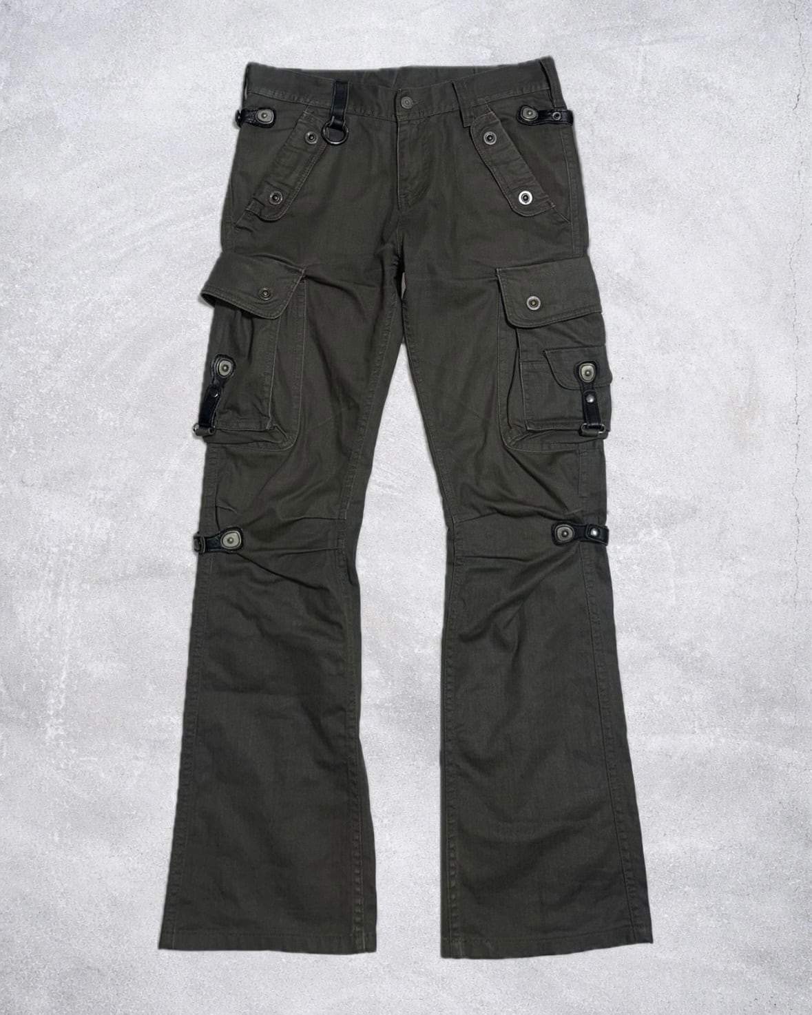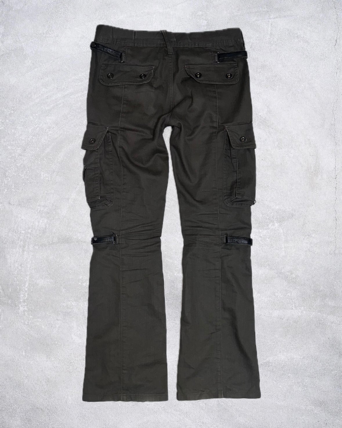太ももから膝にかけて走るストラップと立体的なポケットワークが視覚的なレイヤーを形成したTORNADO MARTのギミックアイテム。ボンテージ由来のストラップと鈍い光沢が異様な雰囲気を醸し出す希少性の高いプロダクト。
