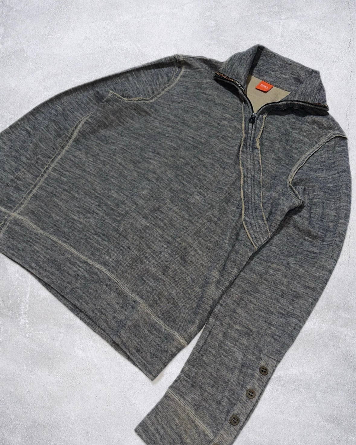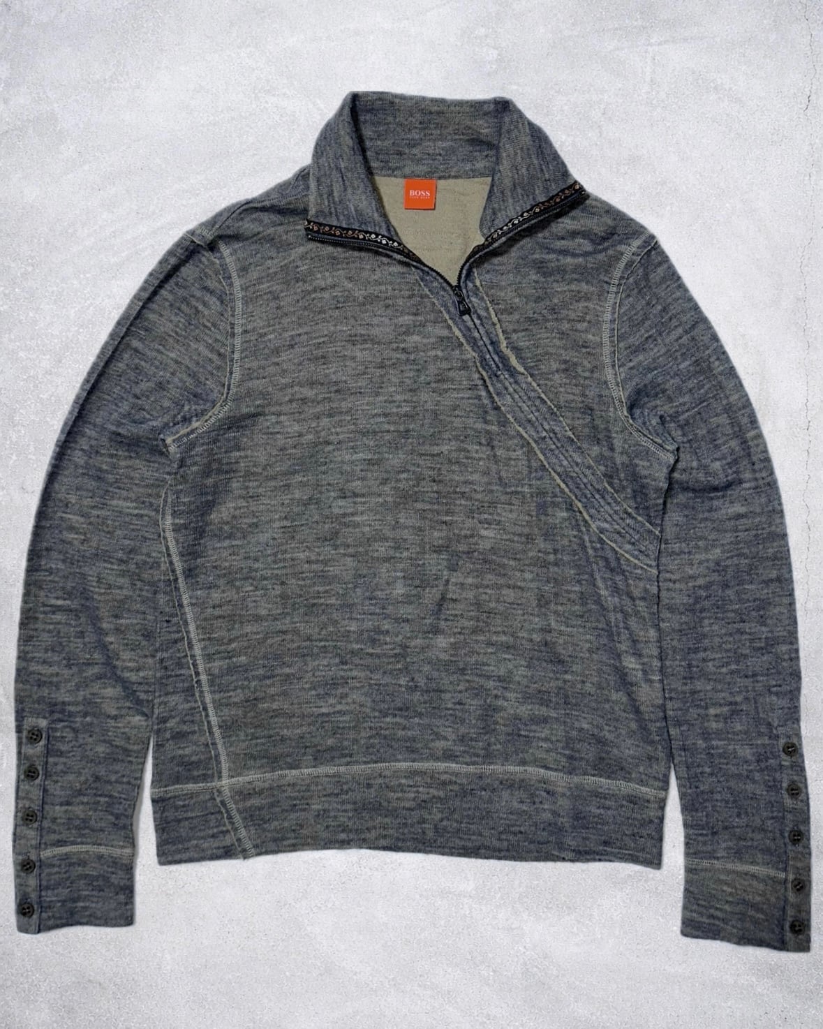 ネックから斜めに落ちるジップと、非対称に走るシーム構成。直線的に軸を収めないBOSS Orangeに見られる意図的な逸脱。整えたレイヤーにわずかなズレを生むようなノイズを内包したプロダクト。