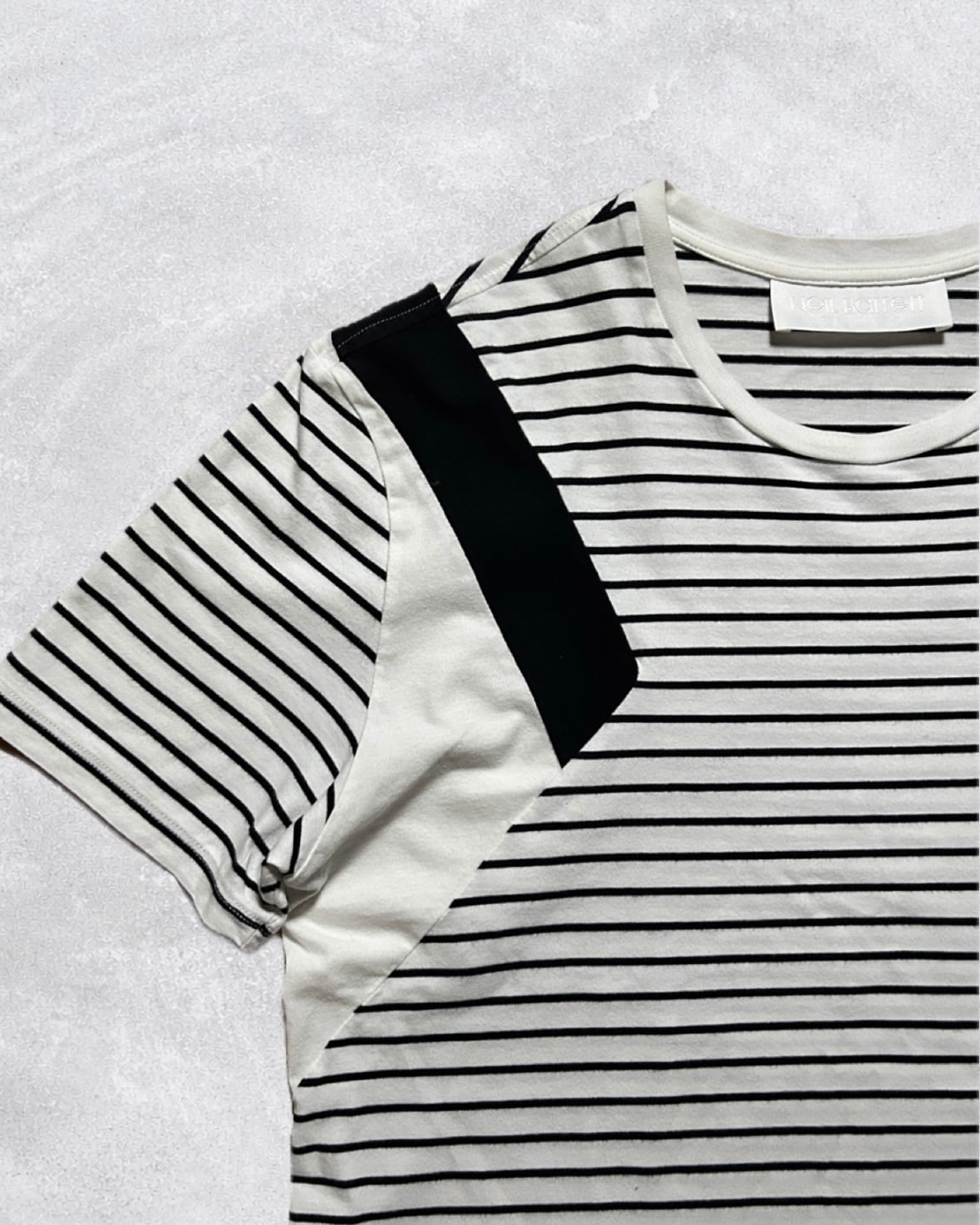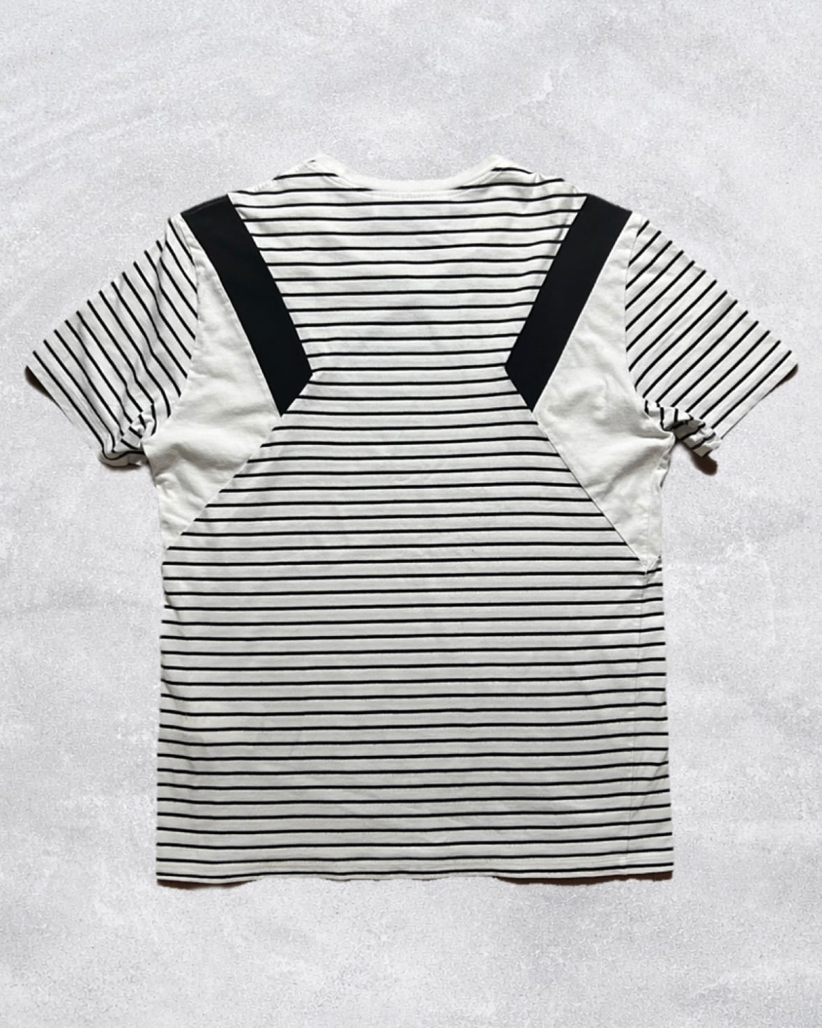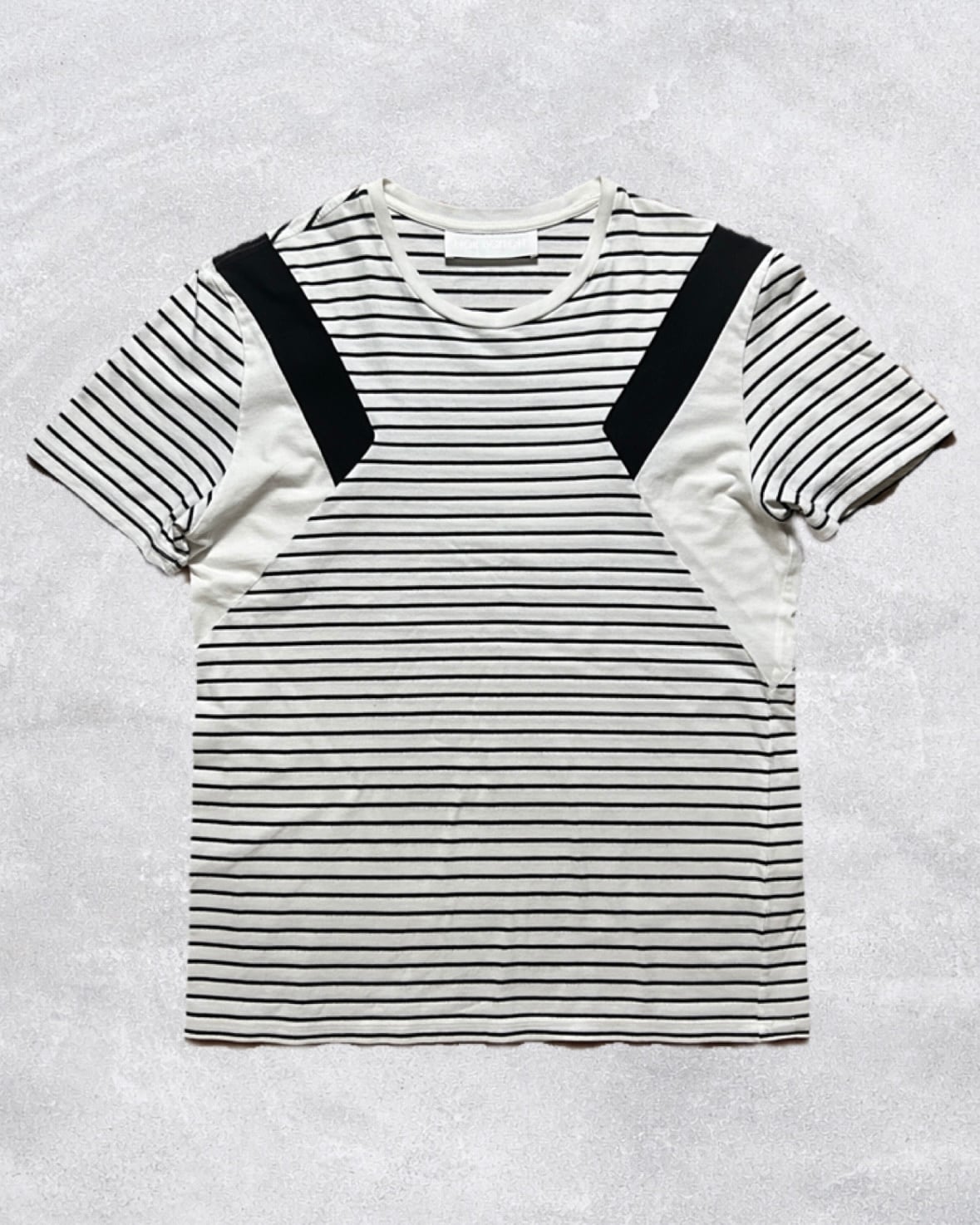 規則的に並ぶボーダーラインの上に、ショルダーから脇へと走るブラックパネルを配置。Neil Barrettは都会的なミニマリズムを迷いなく表現する。